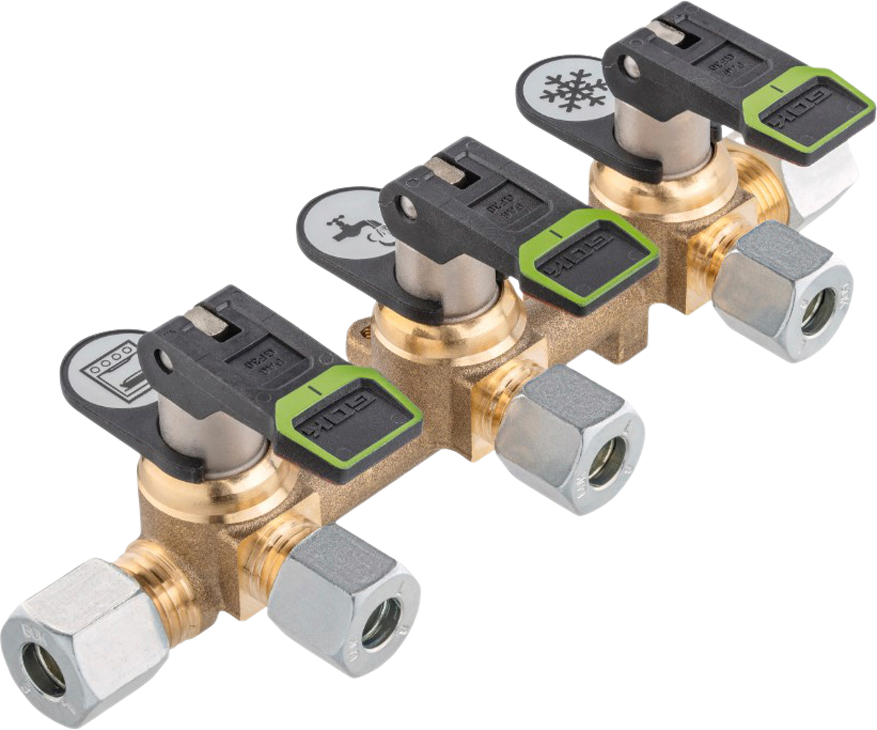Verteilerblock Typ KSV-AB Schnellschlussarmatur, nur volle Offen- bzw. Geschlossenstellung * Betätigungselement: ergonomischer Kipphebel * farbliche Kennzeichnung der Offen- (grün) bzw. Geschlossenstellung (rot) * geringer Druckverlust durch optimierte Funktion * mit Befestigungskonsole * inklusive Clipsen mit Symbolen zur Kennzeichnung der Verbrauchsgeräte * inklusive einem Blindstopfen im Ausgang Art Gasregler, Gasschläuche: Leitungen und Zubehör, Ausführung: RVS10, Größe: AB3