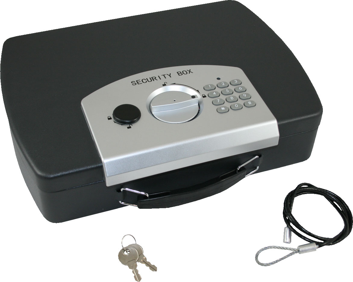 Digitaler Safe zur Aufbewahrung Ihrer Wertsachen! Die Öffnung und die Tastatur befinden sich an der Oberseite der Box und mittels der Tastatur können Sie Ihren persönlichen Sicherheitscode eingeben. Batterien (4x AA) nicht im Lieferumfang enthalten. Falls Sie die Kombination vergessen haben oder die Batterien leer sind, können Sie ganz einfach den im Lieferumfang enthaltenen Notschlüssel verwenden. Lieferumfang: * Digitaler Safe * Sicherheitskabel 90 cm * Notschlüssel Art Sicherheitszubehör: Safe, Farbe: schwarz, Gewicht: 1,85 kg, Material: Metall, Maße (LxBxH): 32 x 23 x 8 cm