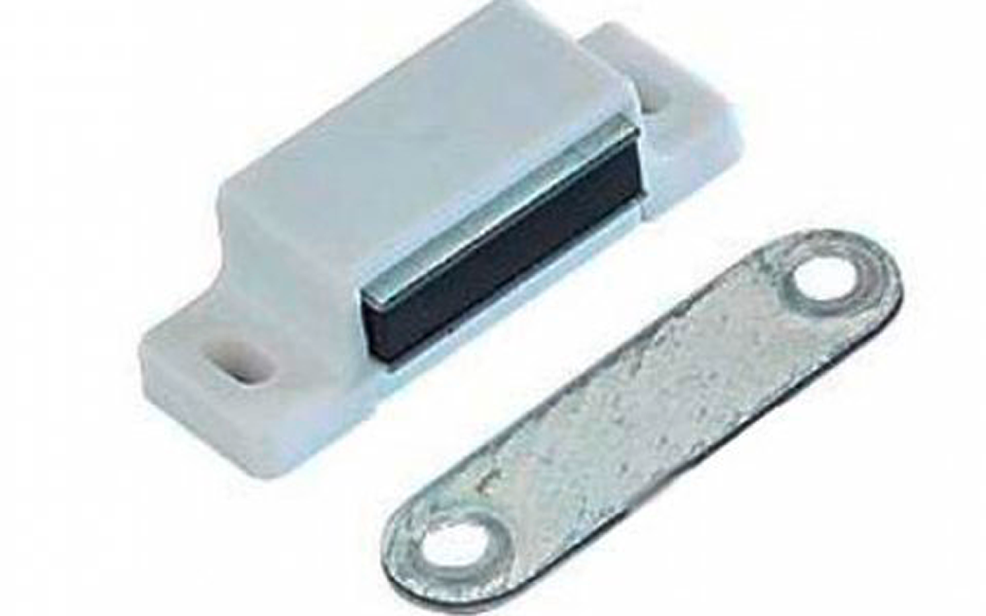 Dauer-Magnetverschluß, zum Anschrauben. Gegenstück Ganzmetall, ebenfalls zum Anschrauben. Haftkraft 4 kg. Art Scharniere, Schlösser, Beschläge: Verschluss, Material: Kunststoff, Farbe: weiß