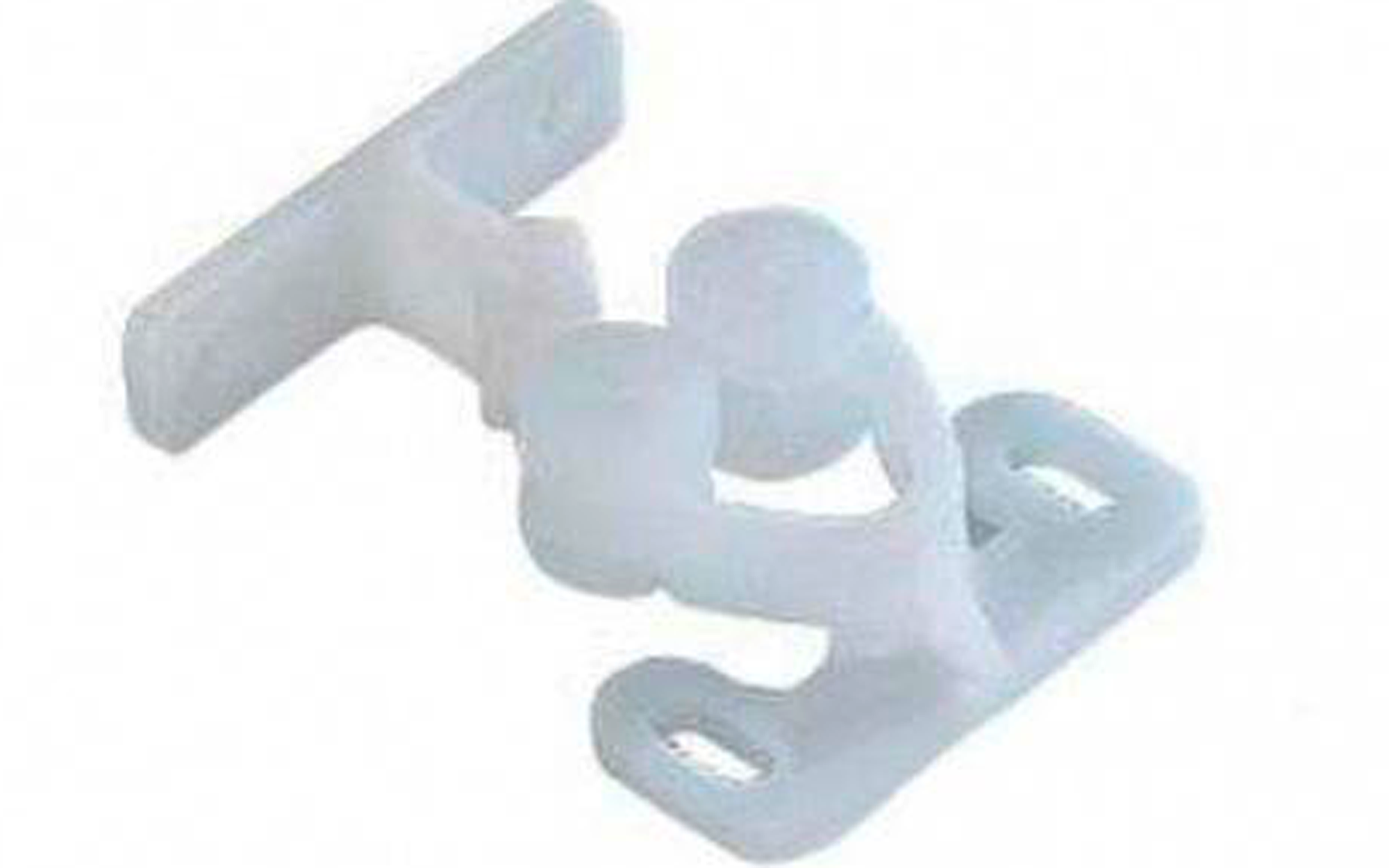 Doppelrollen-Schnäpper aus Polyamid, 2-teilig, zum Anschrauben. Öffnet und schließt geräuschlos. Art Scharniere, Schlösser, Beschläge: Schnäpper, Material: Polyamid, Lochabstand: 24 mm, Farbe: weiß, Maße (LxBxH): 26 x 32 x 12 mm