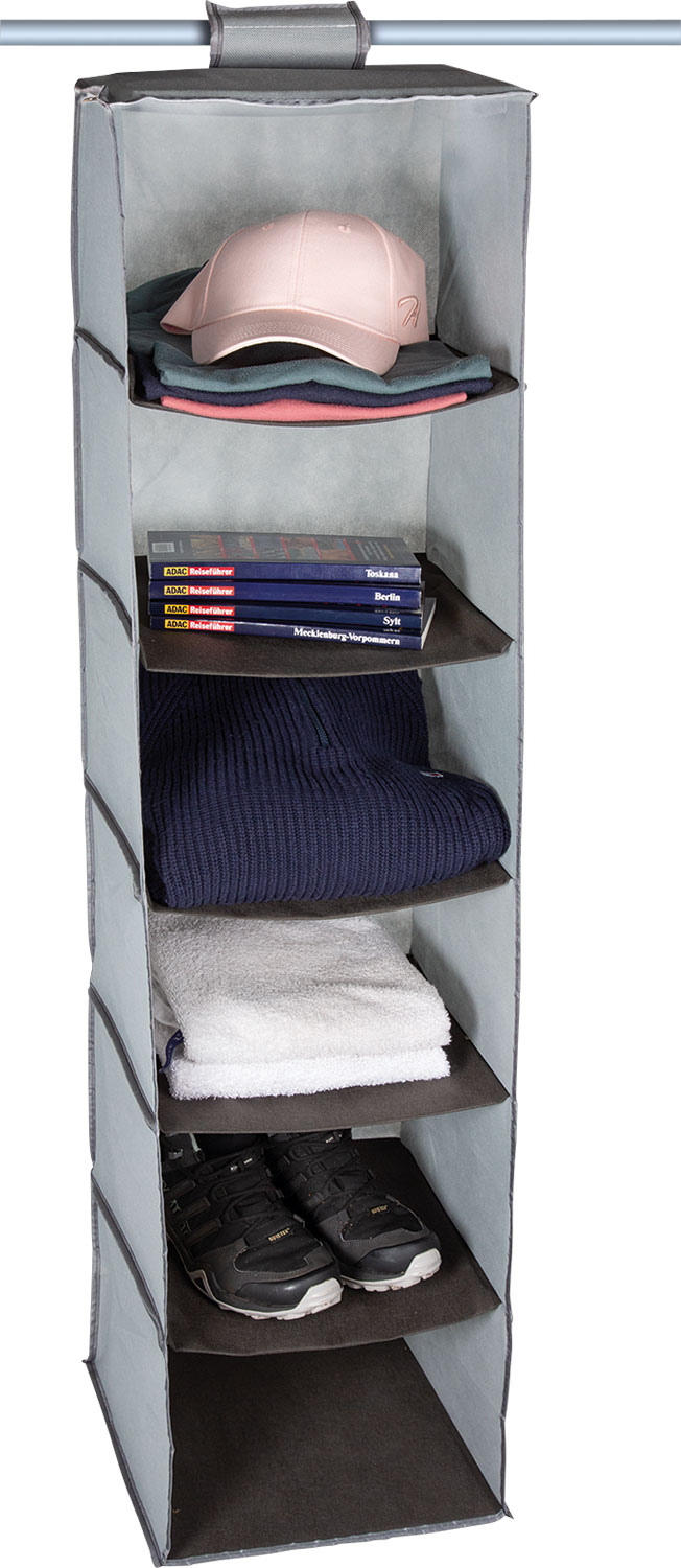 Im Campingurlaub und im Haushalt sinnvolle Lösungen für die Aufbewahrung, Ordnung und Übersicht schaffen. Diese Allrounder ermöglichen durch die verstärkten Einlegeböden getrennte Unterbringung von T-Shirts, Handtüchern / Spielzeug / Schuhen / Magazinen / Büchern / Gläsern. Entsprechend dem Hindermann-Qualitätsanspruch überzeugen praxisorientierte Details, wie verstärkte Einlegeböden, ein atmungsfähiges und dickeres Nonwoven sowie die Aufhängeschlaufe mit Klettverschluss den Camper. Untergebracht an der Stange im Kleiderschrank ergibt sich durch die Ablagefächer zusätzlicher Stauraum. Diese mobilen Regale sind in frischen, neuen Farben gehalten. Die Außenflächen sind hellgrau, die verstärkten Einlegeböden sind im Kontrast rauchgrau. Die neuen Multitalente von Hindermann entfalten sich mit einem Handgriff zu einem Regal bzw. Schrank und können dank flexibler Seitenwände wie eine Ziehharmonika zusammengedrückt und platzsparend verstaut werden. Hängeregal, ohne Boxen mit 6 Fächern, ca. 120 × 30 × 30 cm, Material: Nonwoven (atmungsfähig), verstärkte Böden Art Campingschränke: Hängetasche/ Hängeschrank, Gewicht: 1 kg, Material Bezug: 100% Polypropylen, Staufächer: 6 Stück, Maße offen (BxHxT): 30 x 120 x 30 cm
