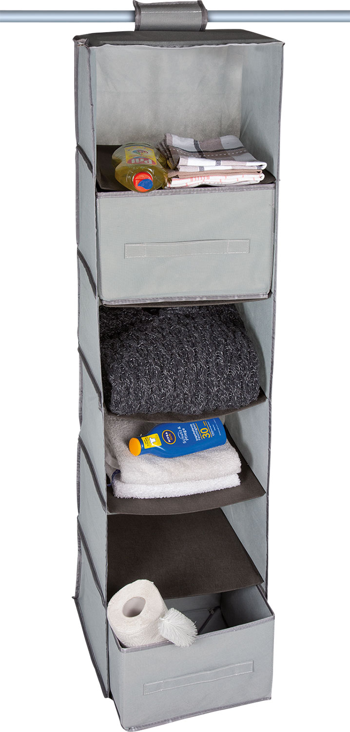 Im Campingurlaub und im Haushalt sinnvolle Lösungen für die Aufbewahrung, Ordnung und Übersicht schaffen. Diese Allrounder ermöglichen durch die verstärkten Einlegeböden getrennte Unterbringung von T-Shirts, Handtüchern / Spielzeug / Schuhen / Magazinen / Büchern / Gläsern. Entsprechend dem Hindermann-Qualitätsanspruch überzeugen praxisorientierte Details, wie verstärkte Einlegeböden, ein atmungsfähiges und dickeres Nonwoven sowie die Aufhängeschlaufe mit Klettverschluss den Camper. Untergebracht an der Stange im Kleiderschrank ergibt sich durch die Ablagefächer zusätzlicher Stauraum. Diese mobilen Regale sind in frischen, neuen Farben gehalten. Die Außenflächen sind hellgrau, die verstärkten Einlegeböden sind im Kontrast rauchgrau. Die neuen Multitalente von Hindermann entfalten sich mit einem Handgriff zu einem Regal bzw. Schrank und können dank flexibler Seitenwände wie eine Ziehharmonika zusammengedrückt und platzsparend verstaut werden. Hängeregal, mit zwei Boxen, mit 4 Fächern und 2 Schubfächern, die auch separat als Körbe genutzt werden können, ca. 120 × 33 × 33 cm, Material: Nonwoven (atmungsfähig), verstärkte Böden Art Campingschränke: Hängetasche/ Hängeschrank, Gewicht: 1 kg, Material Bezug: 100% Polypropylen, Staufächer: 6 Stück, Maße offen (BxHxT): 33 x 120 x 33 cm