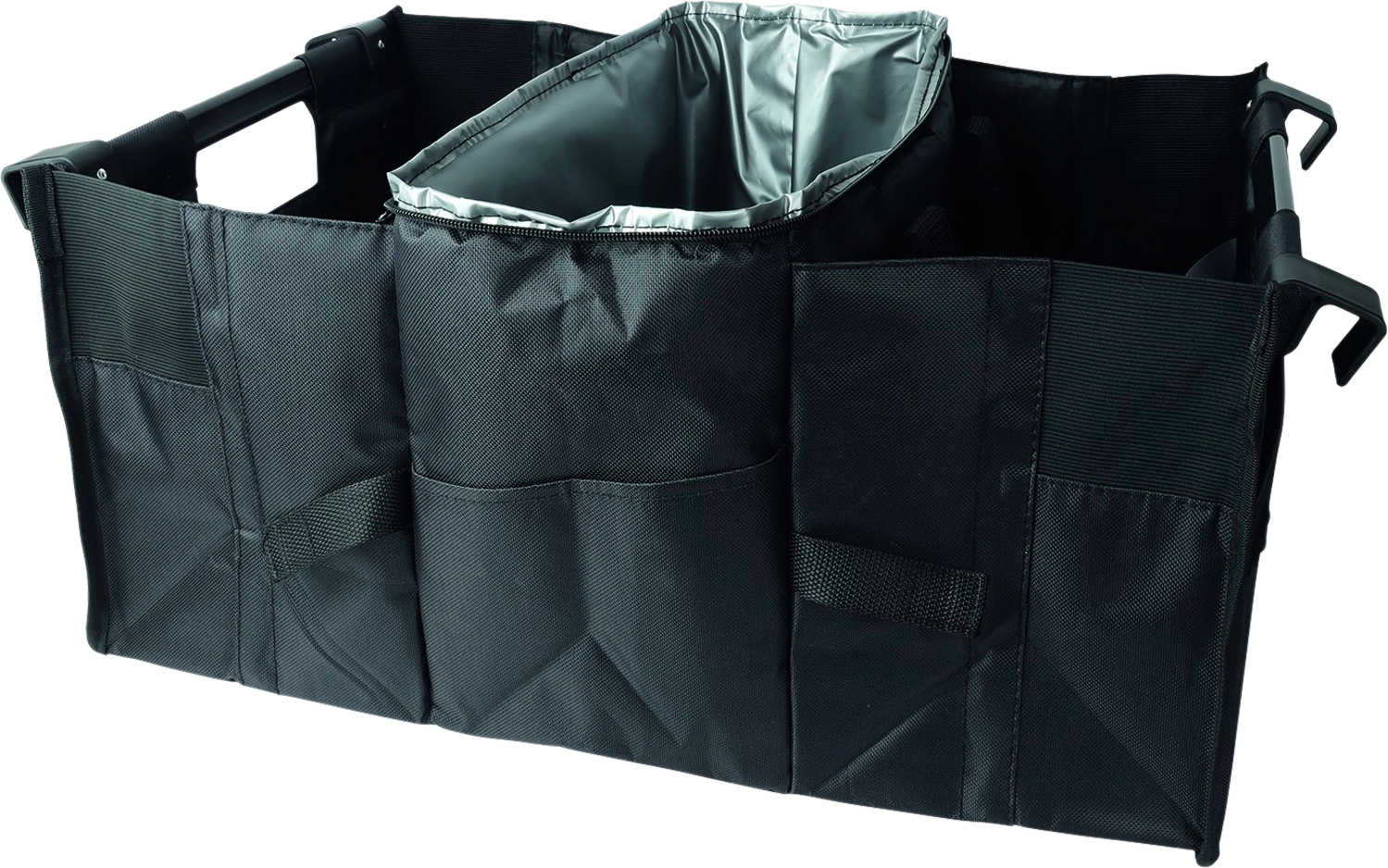 Multifunktionale Aufbewahrungstasche mit Kühlfach – ideal für Kofferraum und Einkauf Diese praktische Aufbewahrungstasche mit integriertem Kühlfach ist die perfekte Lösung für unterwegs, im Alltag oder beim Einkaufen. Sie sorgt für Ordnung im Kofferraum und lässt sich dank der Klettbänder sicher fixieren. Besonders clever: Die Tasche kann direkt in einen Einkaufswagen eingehängt werden und ist flach zusammenfaltbar, wenn sie nicht gebraucht wird. Zwei zusätzliche Einschubfächer bieten Platz für kleinere Utensilien, und dank Schnellverschluss lässt sich das Volumen flexibel anpassen. Die stabilen Tragegriffe und separaten Trageriemen am Kühlfach machen den Transport komfortabel – das Kühlfach kann auch separat genutzt werden. Details * Geeignet zur organisierten Aufbewahrung im Kofferraum * Integriertes Kühlfach – ideal auch beim Einkauf * Klettbänder an der Unterseite für rutschfesten Stand * Flach zusammenfaltbar zur platzsparenden Lagerung * Zwei zusätzliche Einschubfächer für Kleinteile * Schnellverschluss zur Größenanpassung * Stabile Tragegriffe und separater Trageriemen für Kühlfach Technische Daten * Gewicht: 1,19 Kilogramm * Maße: 13 × 39 × 29 Zentimeter (Länge × Breite × Höhe) * Material: Polyester mit Isolierschicht im Kühlfach * Farbe: Schwarz/Grau * Anwendung: Organisation, Transport, Kühlung Lieferumfang * 1x Aufbewahrungstasche mit integriertem Kühlfach Art Tasche: Packtasche, Farbe: schwarz, Gewicht: 1,19 kg, Maße (LxBxH): 13 x 39 x 29 cm, Passend für: ideal für Kofferraum und Einkauf, Volumen: 14 l