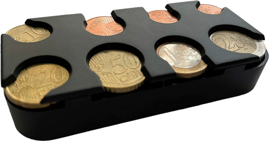 Mit 8 Fächern zur übersichtlichen Aufbewahrung der Münzen, selbstklebend. * Material: Kunststoff * Maße: 10,4 x 5,5 x 2,6 cm Farbe: schwarz, Maße (LxBxH): 8,3 x 5,8 x 3 cm