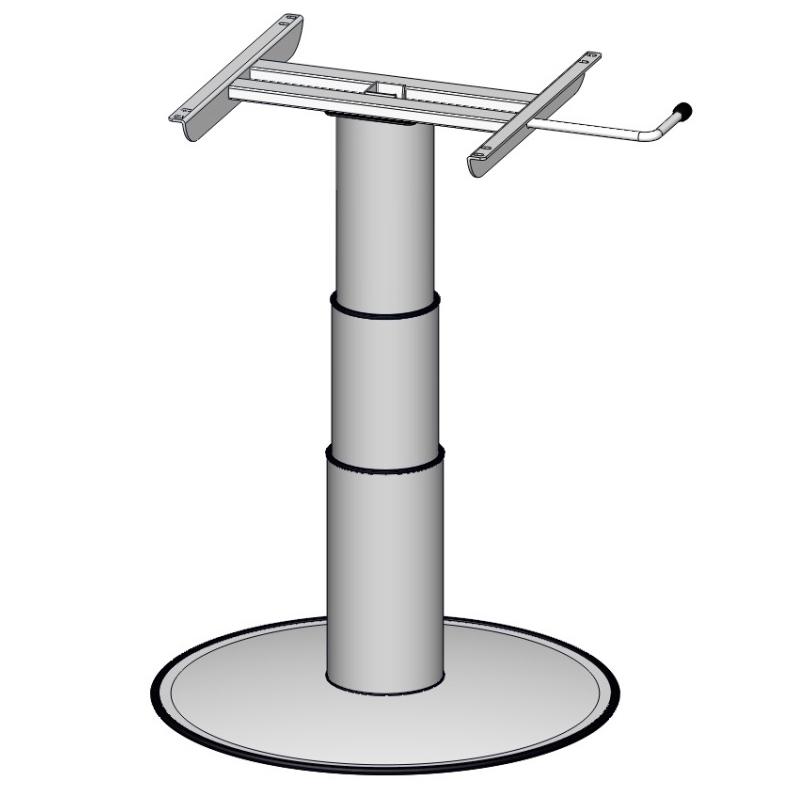 Höhenverstellung mit Bedienhebel und einer runden Sockelplatte. Gewicht 10 kg. Art Tischgestelle: Hubtisch, Höhenverstellung: Höhe von 320 – 695 mm (Unterkante Tischplatte), Farbe: Gussgrau, Gewicht: 10 kg, Maße (LxB): 344 x 342 mm