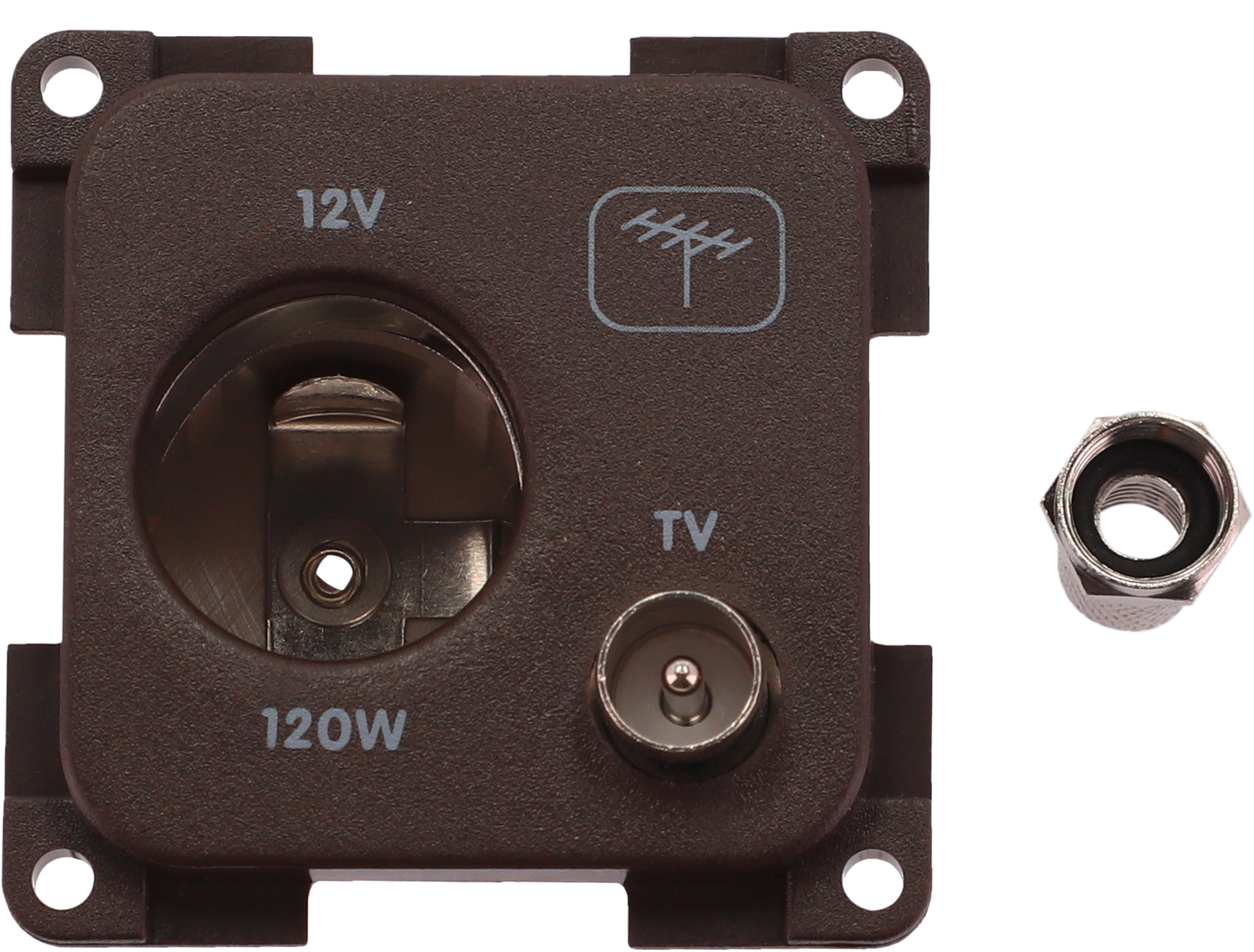 12V AUTO + TV aus Kunststoff mit Schraubanschluß Details * TV-Kabelanschluss = TV Art Kabel, Kupplung, Schalter und Stecker: Steckdose, Ausführung: 12V AUTO + TV, Farbe: braun, Passend für: TV-Kabelanschluss: 7 mm