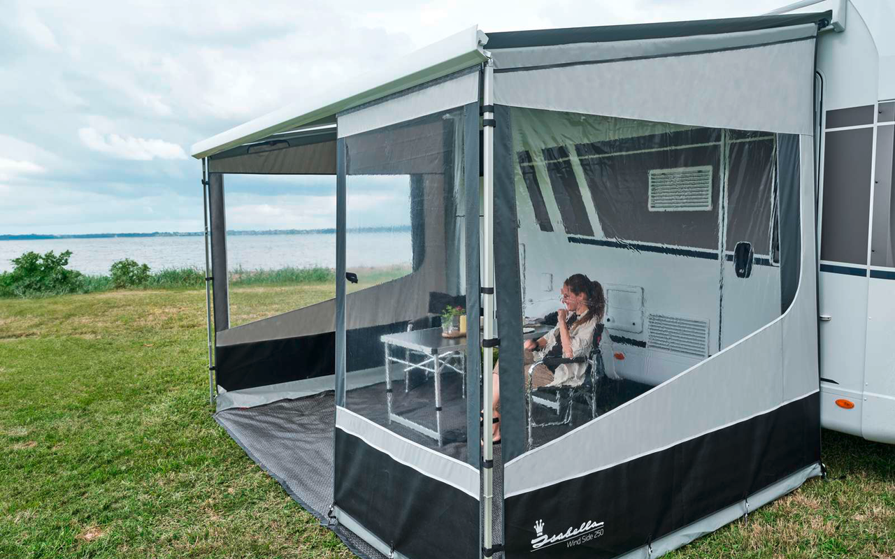 Isabella Wind Front – Zusätzlicher Schutz für Deine Markise (120 oder 220 cm) Mit der Isabella Wind Front gestaltest Du einen geschützten, gemütlichen Bereich unter Deiner Markise – perfekt für mehr Privatsphäre und Wetterschutz. Sie wird ganz einfach an Deinem ausrollbaren Vorzelt befestigt und lässt sich ideal mit einer Wind Side kombinieren. Das große Fenster sorgt für viel Licht, das robuste IsaLite-Gewebe für Wetterfestigkeit und ein kleines Packmaß. Details: * Verfügbar in 120 cm oder 220 cm Breite * Großes Klarsichtfenster für viel Tageslicht * Langlebig, UV-beständig und wasserabweisend * Passend für Fahrzeuge mit Montagehöhe 245–270 cm * Kompatibel mit Markisen von Thule, Fiamma und Dometic Technische Daten: * Breite: 120 cm oder 220 cm * Höhe: 200–223 cm * Montagehöhe: 245–270 cm * Frontmaterial: IsaLite (Polyester, 195 g/m²) – leicht, abwaschbar, geruchsneutral * Sockelmaterial: PVC (350 g/m²) * Farbe: Grau Lieferumfang: * 1x Wind Front (120 oder 220 cm) * 1x Satz Heringe * 1x Transporttasche * 1x Anleitung Art Markisenwand /-Zelt: Vorderwand, Material: Polyester, Anbauhöhe von: 245 cm, Anbauhöhe bis: 270 cm, Breite: 110 cm, Farbe: grau