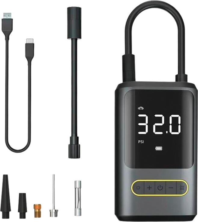Tragbarer elektrischer Mini-Kompressor mit Akku. Multifunktional und kabellos. Geeignet für Fahrradreifen, kleine und mittelgroße Autoreifen (inkl. SUV), Motorradreifen, aufblasbares Spielzeug. Perfekt für Camping, Wanderungen, Urlaub uvm. Stoppt automatisch beim Erreichen des eingestellten Luftdrucks. Druck 10 bar. Sehr leise unter 85dB. Hohe Luftleistung (35 ltr./min). Inkl. verschiedene Adapter, LED Licht (20 Lumen) und USB + USB-C Anschluss. Luftschlauchlänge: 200 mm± 10 mm 5 verschiedene voreingestellte Luftdruckmodi (Manuell, Fahrrad, Motorrad, Auto, Bälle). Der elektrische Luftkompressor ist mit 2 leistungsstarken 2000mAh wieder aufladbaren Lithium-Batterien ausgestattet, die als Netzteil zum Aufladen verwendet werden können. Technische Daten: Batteriekapazität: 2 Stück 2000 mAh Lithiumbatterie Produktleistung: 80 W Arbeitsspannung: DC 7,4 V Betriebsstrom: =7A Kolbendurchmesser: 19 mm Maximaler Luftdruck: 150 psi Luftvolumen: 35 l/min LED-Lichtlumenwert: 20LM Lärm: weniger als 85 dB Ladezeit: ca. 2-3 Stunden USB-Netzspannung: 5 V Luftschlauchlänge: 200 mm ± 10 mm Art Sicherheitszubehör: sonstiges Sicherheitszubehör