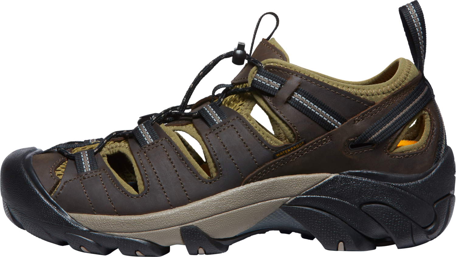 Die besten Eigenschaften eines Wanderschuhs und einer Sandale vereint. Offene Lufteinlässe im wasserfesten Leder sorgen für Atmungsaktivität, und die stollenähnliche Außensohle bietet Halt auf dem Trail. Details * KEEN.ALL-TERRAIN Gummi-Außensohle für sicheren Grip * 5 mm Flexionskerben in der Sohle für bessere Bodenhaftung * Fersensicherungssystem für zusätzliche Stabilität * Stabilitätschaft für leichte Unterstützung * Ökologisch bevorzugtes Premium-Leder aus LWG-zertifizierter Gerberei * Per- und polyfluorierte Chemikalien (PFAS)-frei, dauerhaft wasserabweisend * Eco Anti-Odour für natürliche Geruchskontrolle * Original Fit – Die ikonische KEEN-Passform mit großzügigem Platz im Vorfußbereich, damit sich die Zehen ausbreiten können * Gewicht: 419 g * Schafthöhe: 57 mm * Absatzhöhe: 65 mm * Sprengung: 19 mm Materialien * Obermaterial aus wasserfestem Leder * Lace-Lock Bungee System * Schnelltrocknendes Futter für den aktiven Einsatz * EVA-Fußbett mit Unterstützung für das Fußgewölbe für ganztägigen Komfort * Abriebfeste multidirektionale Stollen für erhöhte Traktion Reinige den Schuh mit einer weichen Bürste oder Tuch, um losen Schmutz zu entfernen. Hartnäckige Flecken können einen Lederreiniger erforderlich machen. Art Schuhe: Wanderschuh, Geschlecht: Herren, Material: wasserfestes Leder, Wasserdicht: Ja, Farbe: Canteen/Black, Größe: 42