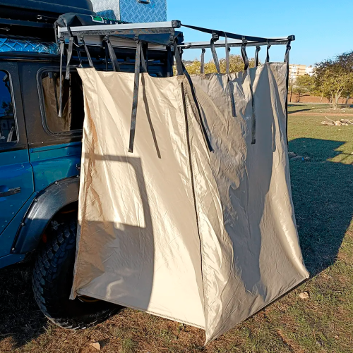 K’Foam Duschkabine Dank unserer Duschkabine erhalten Sie ein zusätzliches Plus an Komfort bei Ihren 4×4-Fahrten, da sie sehr schnell zu montieren und sehr praktisch ist. Sie bietet eine Kabine, die Sie zum Duschen oder als Umkleidekabine nutzen können. Wichtig: Bitte beachten Sie, dass es einen Einbausatz gibt, der je nach Fahrzeug angepasst werden muss, aber in der Regel sollte es keine Probleme geben, wenn es einen Dachträger hat. Wenn Sie zu den Menschen gehören, die sich gerne in der Natur aufhalten und gleichzeitig die Annehmlichkeiten der Stadt genießen, dann werden Sie sicherlich den Wert einer guten Dusche zu schätzen wissen, wenn Sie sich in der Natur aufhalten. Die Duschkabine ist ein erschwingliches Gerät, das Sie in Ihr Auto einbauen können, damit Sie während eines Campingausflugs immer dann duschen können, wenn Sie es am meisten brauchen. Sie können ihn sogar benutzen, um Ihre Kleidung zu wechseln, ohne sich Sorgen zu machen. Wie funktioniert eine Camper-Duschkabine? Eine Duschkabine ist ein relativ einfaches Gerät, das sehr leicht zu bewegen, zu installieren und zu benutzen ist. Es handelt sich um ein kleines, tragbares Zelt, das in wenigen Minuten direkt auf dem Dachgepäckträger des Fahrzeugs befestigt wird. Sobald die Basis am Fahrzeug befestigt ist, kann die Höhe der Kabine mit Hilfe der Begrenzungsbänder (je nach Größe des Fahrzeugs) eingestellt werden, um zu verhindern, dass der Stoff unnötig am Boden reibt und schmutzig oder beschädigt wird. Die Duschkabine verfügt über zwei seitliche Reißverschlüsse, die den Zugang zum Innenraum ermöglichen, sowie über zwei Seitentaschen, in denen sich allerlei Dinge wie Seife oder eine Uhr während des Bades verstauen lassen. Um den Campern die Benutzung zu erleichtern, wird die Duschkabine mit einem kompletten Montagesatz geliefert, der Beschläge, Halterungen, feste Schlüssel, einen Satz Etiketten und eine Tragetasche enthält. Vergessen Sie die Zeiten, in denen das Baden auf dem Campingplatz mühsam war, und genießen Sie das Erlebnis, mit der Natur in Kontakt zu sein, mit einer Camping-Duschkabine, die Sie hier kaufen können. Warum eine Duschkabine benutzen? Wenn wir campen gehen, sind wir in der Regel bereit, eine völlig natürliche Erfahrung zu machen, bei der sogar die Frage der persönlichen Sauberkeit in den Hintergrund tritt und fast schon eine Art Tradition ist. Doch in unserer modernen Zeit, in der wir uns ständig an neue Dinge und Situationen anpassen, kommt die Idee auf, eine Duschkabine für die einfache Toilette beim Camping zu verwenden, was für viele ziemlich umständlich ist. Stellen Sie sich vor, Sie haben den ganzen Tag Vögel beobachtet oder den Nachmittag mit Angeln verbracht, und am Abend wollen Sie ein Lagerfeuer machen. Würden Sie nicht auch gerne die Zeit vor dem Schlafengehen mit einem Gefühl der Kühle verbringen, das Ihnen hilft, sich zu entspannen und einzuschlafen? Sie können dieses Gefühl der Ruhe erzeugen, indem Sie Ihre tragbare Campingtoilette mitnehmen und eine schöne Dusche nehmen. Mit diesen Kabinen verlieren Sie die Angst, sich schmutzig zu machen oder sich unwohl zu fühlen, und haben die Gewissheit, dass Sie duschen können, wenn Sie es am meisten brauchen. Kommen Sie jetzt und denken Sie nicht länger darüber nach, hier haben wir die beste Duschkabine auf dem Markt. Holen Sie sich eine widerstandsfähige und nützliche Ausrüstung, die Sie eine neue Erfahrung im Kontakt mit der Natur erleben lässt. * Mit Aluminiumrahmen * Sie besteht aus 420D Oxford-Gewebe in der Farbe Beige * 100% wasserdichtes Material mit UV-Schutz * Verstellbare Gurte für unterschiedliche Körpergrößen * Nimmt sehr wenig Platz in Anspruch * Ein Paar wasserdichte Aufbewahrungsbeutel aus Polyvinylchlorid (PVC) * Hochwertige seitliche Reißverschlüsse * L-förmiger Bügel, Beschläge und Heringe * Dies ist eine Duschkabine, die an der Decke befestigt wird * Erweiterte Kabinenmaße: 105 x 105 x 160 x 160 bis zu 210 cm * Abmessung…