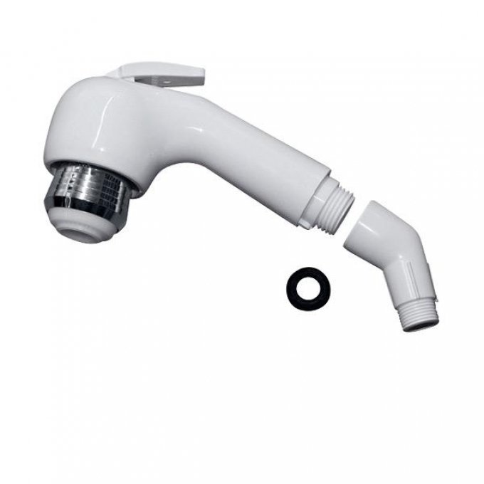 Kunststoffbrause mit Winkel und Kombi-Brausekopf. Einstellbar: Impuls, Dauerlauf, abstellbar. Mit Perlator. Anschluss an ½“ ohne Winkel oder 3/8“ mit Winkel. Art Campingdusche: Stellbrause, Drehbar: Nein, Material: Kunststoff, Farbe: weiß