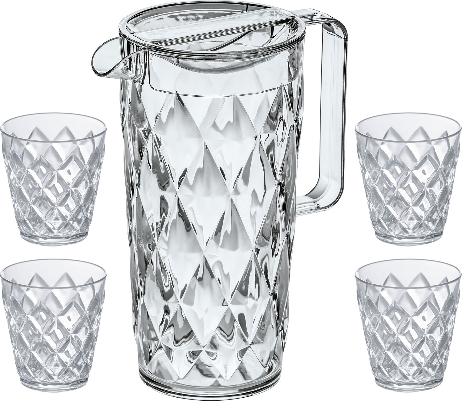Raffinierte Optik und haptisch ein Genuss! Die Karaffen-Set CRYSTAL inkl. Deckel und 4 Trinkbechern ist ein hinreißender Eyecatcher für innen und außen! Die Form ist inspiriert durch handgeschliffenes Glas, die Umsetzung zeitgemäß in modernem Werkstoff. Der Deckel schützt die Getränke ideal vor Schmutz und Insekten. Wie gemacht für sommerlich leichte Limonaden, aromatische Säfte und natürlich erfrischenden Cidre! BPA-freier Kunststoff und wiederverwendbar. Anzahl: 4: 4 tlg, Art Trinkgläser: Kannen/Karaffen, Farbe: transparent, Gewicht: 640 g, Spülmaschinengeeignet: Ja, Volumen: 1,6 l, Material: Koziol Thermoplastik (recyclebar)