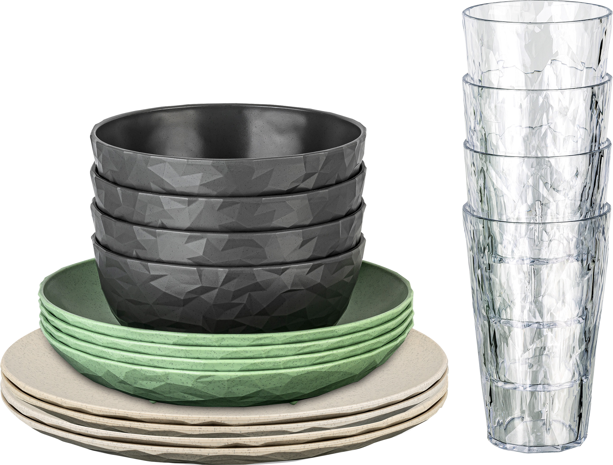 Exklusives Göteborg Geschirr-Set 16-tlg. Das Geschirrset ist aus umweltfreundlichem thermoplastischem Kunststoff hergestellt und bringt frischen Wind in jeden Outdoor-Lunch oder Terrassen-Dinner und hält auch turbulenten Feiern ohne jeden Scherbenhaufen stand. Die solide Materialität und die modernen Farben vermitteln stets das gute Gefühl eines schön gedeckten Tisches. Das Material bleibt lange schön und ist natürlich spülmaschinenfest. Ideal für alle Outdoor-Aktivitäten, bei denen man auf stilvolles Geschirr keineswegs verzichten möchte. Abgerundet wird das 16-teilige Set durch vier formschöner Trinkbecher. Wasser, Longdrinks, Säfte oder Limonade – dieser Becher kann wirklich alles! Damit wird er in- und außerhalb des Hauses ganz schnell zum Vierjahreszeiten-Universaltalent, das zudem mit seiner faszinierenden Facettenstruktur viel Leben auf Tisch und Tafel bringt. Seine organische Haptik der Außenseite lässt sich auch von Kinderhänden sicher greifen – und sollte er doch einmal herunterfallen, bleibt er ganz! Da man unter diesen Voraussetzungen eigentlich nie genug Exemplare von CLUBL haben kann, macht sich das Glas im Küchenschrank durch ideale Stapelbarkeit ganz besonders schlank. * aus umweltfreundlichem thermoplastischem Kunststoff * modernes Design und angenehme Haptik * spülmaschinengeeignet Set besteht aus: * 4 Schalen 700 ml, Ø 16 cm * 4 Teller flach Ø 26 cm * 4 Teller tief Ø 22 cm * 4 Gläser 400 ml Spülmaschinenfest: Ja, Material: -, Farbe: Bunt