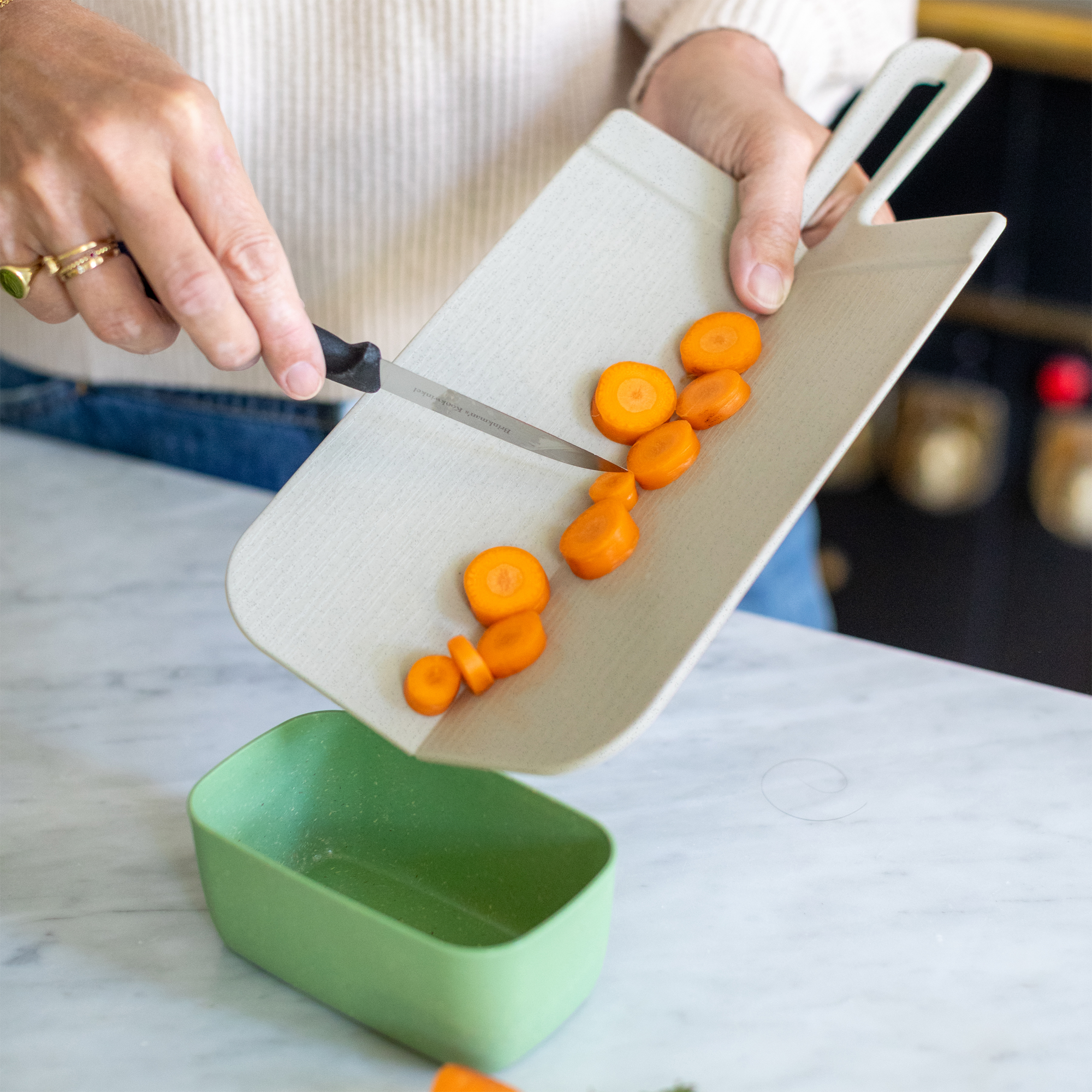 Schneidebrett SNAP S Das Schneidebrett SNAP S überzeugt durch seine praktische Klappfunktion, die das sichere Schütten von Kräutern, Zwiebeln und Gemüse erleichtert. Die kompakte Größe ist handlich, und der abgeschrägte Rand sorgt für einfaches Anheben. Hergestellt aus klingenschonendem Material, 100 % CO₂-neutral und spülmaschinengeeignet. Details * Klappfunktion für sicheres Schütten * Arretierter Einklappwinkel * Abgeschrägter Rand zum Anheben * Klingen schonendes Material * 100 % CO₂-neutral * Spülmaschinengeeignet Lieferumfang * 1x Schneidebrett SNAP S Gewicht: 0,135 g, Maße (LxBxH): 331 x 166 x 5 mm, Material: Organic Bio Circular, Farbe: desert sand