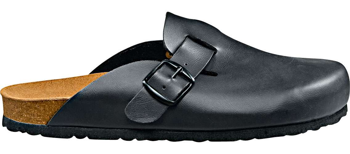 Gut dämpfender, sehr bequemer Clog mit Schnallenverstellung und Kork-Kautschuk Fußbett. Art Schuhe: Sandale, Geschlecht: Unisex, Farbe: schwarz, Größe: 43