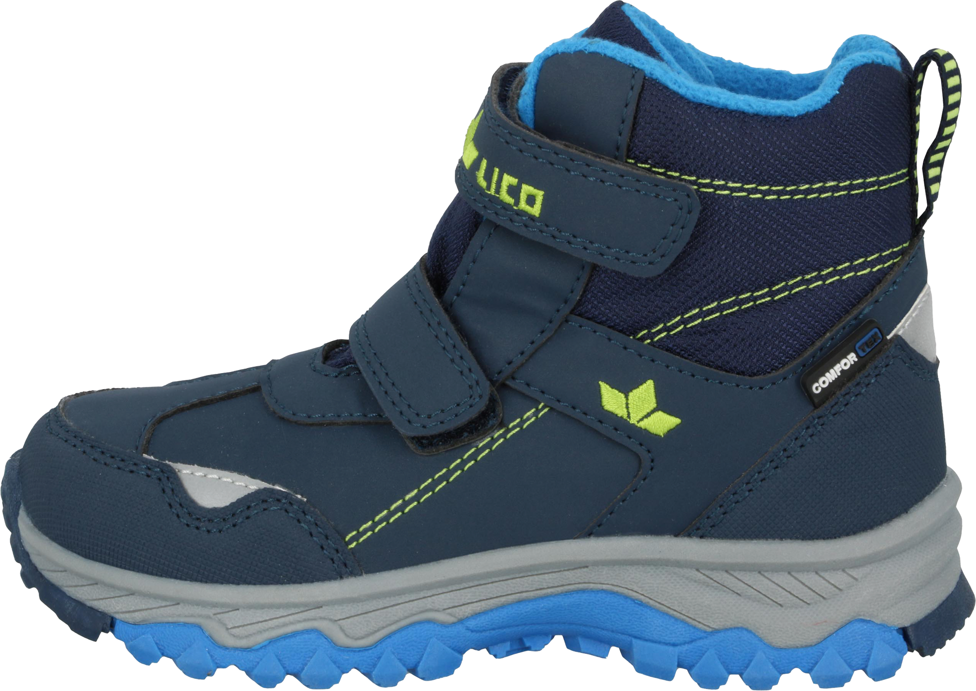 Lico Winterboot für Kinder und Jugendliche – Komfort und Schutz im Winter Der Lico Winterboot für Kinder und Jugendliche ist der ideale Begleiter für kalte und nasse Wintertage. Mit einem robusten Obermaterial aus Synthetik und Nylon-Einsätzen bietet der Boot sowohl Schutz als auch Flexibilität. Die Comfortex-Klimamembrane sorgt für Atmungsaktivität und hält die Füße gleichzeitig trocken. Das warme Innenfutter (100 % Polyester) und die textile Einlegesohle mit zusätzlichem Warmfutter bieten optimalen Komfort und Wärme. Die flexible Thermoplastisches Gummi (TPR)-Laufsohle garantiert sicheren Halt auf verschiedensten Oberflächen. Der praktische Klettverschluss sorgt für ein einfaches An- und Ausziehen. Details * Obermaterial aus Synthetik mit Nylon-Einsätzen für Haltbarkeit * Comfortex-Klimamembrane für wasserdichte und atmungsaktive Eigenschaften * Warmfutter (100 % Polyester) und textile Einlegesohle mit zusätzlichem Warmfutter für Wärme * Flexible TPR-Laufsohle für sicheren Halt und Stabilität * Praktischer Klettverschluss für einfachen Einstieg Technische Daten * Farbe: Blau * Verschluss: Klettverschluss * Stil: Basic * Schafthöhe: Mittel * Obermaterial: Synthetik mit Nylon-Einsätzen * Membran: Comfortex-Klimamembrane * Innenfutter: Warmfutter (100 % Polyester) * Innensohle: Textileinlegesohle mit Warmfutter * Laufsohle: TPR-Laufsohle * Schuhspitze: Rund Art Schuhe: Winterstiefel, Geschlecht: Mädchen & Jungen, Material: 100 % Polyester, Farbe: marine / blau / lemon, Größe: 33