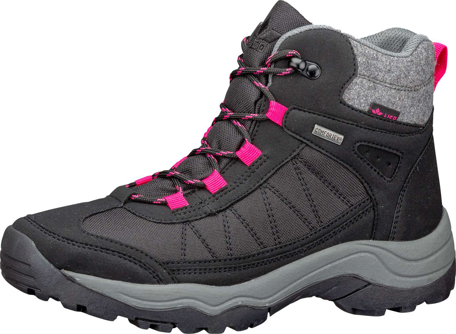 LICO Winterboot Randers in Schwarz/Pink – Warm und wetterfest für den Winter Der LICO Winterboot Randers in Schwarz/Pink ist der ideale Schuh für kalte Tage. Mit einem robusten Obermaterial aus Nylon und Synthetik-Besätzen bietet der Boot sowohl Stabilität als auch Flexibilität. Die Comfortex-Klimamembrane sorgt für eine wasserdichte und atmungsaktive Eigenschaft, während das warme Innenfutter und die textile Einlegesohle mit zusätzlichem Warmfutter für angenehme Wärme sorgen. Die flexible Gummilaufsohle garantiert sicheren Halt auf unterschiedlichen Untergründen. Der praktische Schnürverschluss sorgt für eine optimale Passform. In einem modernen, mehrfarbigen Design ist dieser Winterschuh nicht nur funktional, sondern auch stilvoll. Details * Robustes Nylon-Obermaterial mit Synthetik-Besätzen * Comfortex-Klimamembrane für Wasserdichtigkeit und Atmungsaktivität * Warmfutter und textile Einlegesohle mit zusätzlichem Warmfutter für Wärme * Flexible Gummilaufsohle für sicheren Halt * Schnürverschluss für bequemen Sitz und Passform Technische Daten * Farbe: Schwarz/Pink * Verschluss: Schnürung * Stil: Outdoor, mehrfarbiges Design * Schafthöhe: Mittel * Obermaterial: Nylon mit Synthetik-Besätzen * Membran: Comfortex-Klimamembrane * Innenfutter: Warmfutter * Innensohle: Textileinlegesohle mit Warmfutter * Laufsohle: Gummilaufsohle Art Schuhe: Wanderstiefel, Geschlecht: Damen, Material: Obermaterial: Synthetik, Wasserdicht: Ja, Farbe: schwarz pink, Größe: 37