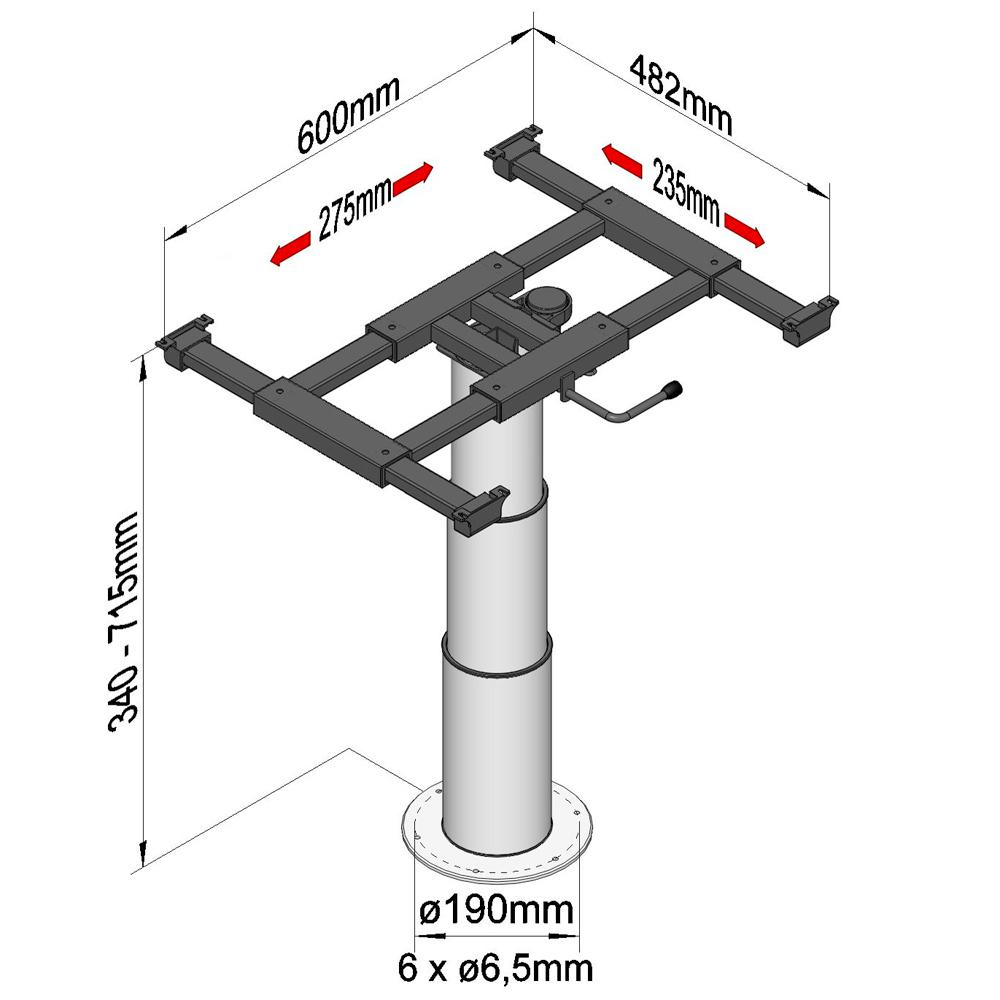 Höhenverstellung mit Bedienhebel. X/Y-Gleitverschiebung. Art Tischgestelle: Hubtisch, Höhenverstellung: von 340 – 715 mm (Unterkante Tischplatte), Tischbeine: 1 Stück, Farbe: Gussgrau, Maße (LxB): 600 x 482 mm