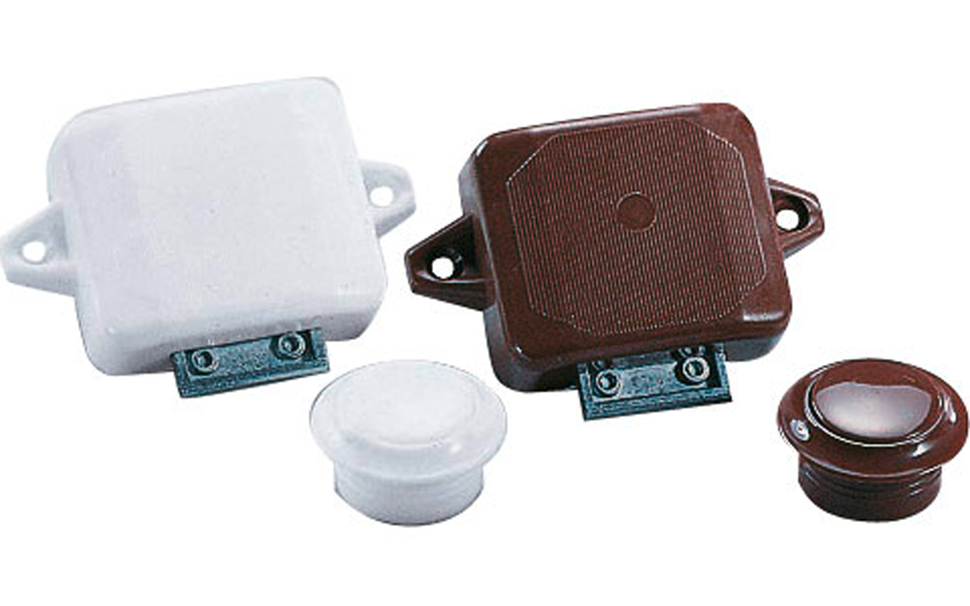 Druckschloß mit Rosette. Durch druck auf den Knopf springt dieser hervor und dient als Griff zum Öffnen der Tür. Beim Schließen wird der Verschluß durch Knopfdruck wieder verriegelt. Material Kunststoff. Für Wandstärken 16-19mm. Art Scharniere, Schlösser, Beschläge: Druckknopf, Material: Kunststoff, Farbe: braun