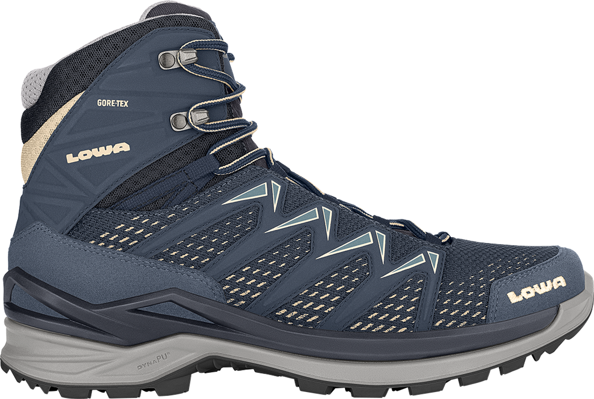 LOWA Innox Pro GTX Mid – athletischer Multifunktionsschuh für Outdoor-Abenteuer Der LOWA Innox Pro GTX Mid ist ein vielseitiger Multifunktionsschuh für sportliche Outdoor-Aktivitäten, der optimalen Wetterschutz bietet. Die wasserdichte und atmungsaktive GORE-TEX-Membran schützt vor Nässe und sorgt für ein angenehmes Fußklima. Mit seinem leichten und flexiblen Design und der ausgezeichneten Passform für mittelbreite Füße ist der Innox Pro GTX Mid perfekt für spontane Abenteuer. Die Zwischensohle aus LOWA DynaPU bietet optimale Dämpfung, während der LOWA-MONOWRAP-Rahmen für stabile Fußführung im Gelände sorgt. Details * Athletischer Multifunktionsschuh für sportliche Outdoor-Aktivitäten * Wasserdichte, winddichte und atmungsaktive GORE-TEX-Membran * Ausgezeichnete Passform für mittelbreite Füße durch spezielle Leistenform * LOWA DynaPU-Zwischensohle für gute Dämpfung * LOWA-MONOWRAP-Rahmen für stabile Fußführung im Gelände Technische Daten * Futter: GORE-TEX * Leistenweite: Standard (für mittelbreite Füße) * Schafthöhe innen: 120 mm, außen: 150 mm * Gewicht (Mustergröße): 930 g pro Paar * Produktion: gestrobelt/angespritzt * Reparaturservice für Naht- und Fersenfutterreparaturen sowie Ersatzteile verfügbar Art Schuhe: Wanderschuh, Geschlecht: Damen, Material: Synthetikmaterial kombiniert mit Textilgewebe, GORE-TEX-Membran, LOWA Multi Trac-Außensohle, Farbe: Jeans/Dune, Größe: 46