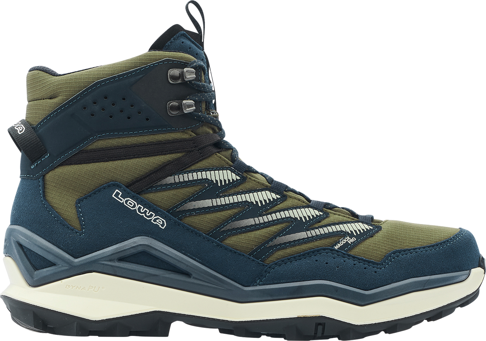 Lowa Maddox Pro GTX Mid – Dynamischer Leichtwanderschuh für maximale Performance Mit dem Lowa Maddox Pro GTX Mid bist du für jedes Terrain gerüstet – vom steilen Anstieg bis zum felsigen Trail. Der sportliche Leichtwanderschuh kombiniert hohe Beweglichkeit mit optimaler Stabilität und sorgt durch seine GORE-TEX-Membran für trockene Füße bei jedem Wetter. Das atmungsaktive Ripstop-Obermaterial schmiegt sich wie eine zweite Haut an deinen Fuß, während die stark profilierte Lowa Fast Hiking-Sohle dir sicheren Grip auf jedem Untergrund bietet. Details: * Hervorragender Halt durch Lowa Fast Hiking-Gummisohle * Dämpfendes DynaPU-Zwischensohlensystem für Komfort und Stabilität * Wasserdicht und atmungsaktiv dank GORE-TEX-Membran * Leichtes, flexibles Ripstop-Obermaterial für optimale Bewegungsfreiheit * Support Frame und Double Injection für zusätzliche Stabilität * Flexible Konstruktion für dynamisches Abrollen Technische Daten: * Obermaterial: 64 % Textil, 36 % Synthetik * Futter: 100 % GORE-TEX * Sohle: Lowa Gummi-Laufsohle mit DynaPU-Dämpfungssystem * Eigenschaften: Wasserdicht, atmungsaktiv, flexibel, stabil * Einsatzbereich: Wandern, Fast Hiking, Alltag Lieferumfang: * 1x Paar Lowa Maddox Pro GTX Mid Wanderschuhe Art Schuhe: Wanderschuh, Geschlecht: Herren, Atmungsaktiv: Ja, Wasserdicht: Ja, Farbe: navy oliv, Größe: 47