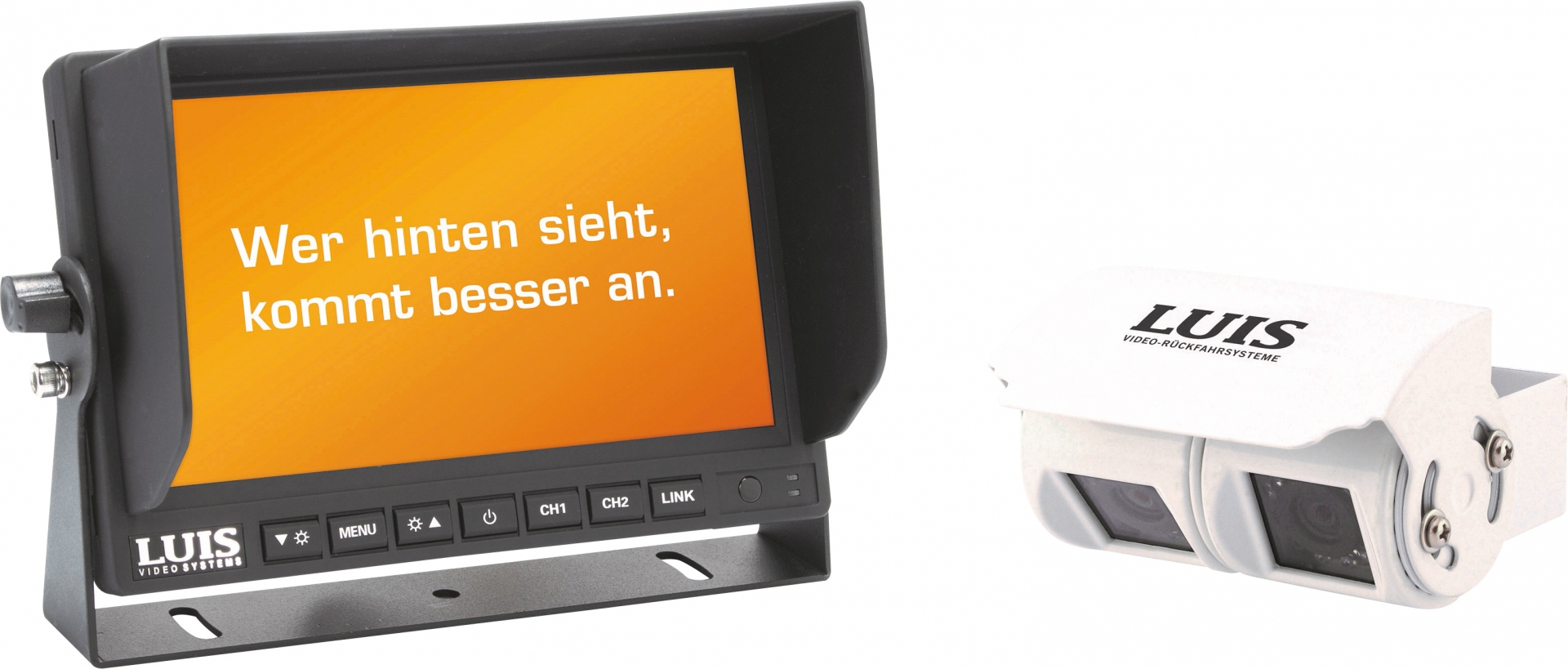 Das LUIS 7“-Twin-Rückfahrsystem ermöglicht dem Fahrer beim Rangieren einen Blick direkt hinter sein Fahrzeug, sowie bei Bedarf zusätzlich und dauerhaft auf den fließenden Verkehr beim Fahren. Die beiden Kameras sind unabhängig voneinander einstellbar und besitzen eine robuste Steinschlag-Schutzscheibe. Wie bei allen Kameras der Professional-Serie wird das Sonnendach und der Kamerafuß aus besonders beständigem Edelstahl gefertigt. Die Kamera selber sitzt in einem robusten Aluminium-Druckgussgehäuse und hält allen Witterungen stand. In der Kamera kommt der bewährte SONY CCD-Sensor mit automatischem Weißabgleich und hochauflösenden 600 TV-Linien zum Einsatz. Dank des leistungsstarken 7“-Monitors mit einer Auflösung von 1.024 x 600 Pixel hebt sich die Auflösung von herkömmlichen System deutlich sichtbar ab. Das Display überzeugt zudem durch seine aufwendige Entspiegelung und Helligkeit von 400 cd/m2. Durch die moderne Nachtsichttechnik der Kamera mit IR LEDs der neusten Generation, kann der Fahrer selbst bei völliger Dunkelheit (0 Lux) den Heckbereich seines Fahrzeugs überblicken Zum System gehören neben 7“-Monitor und Twin-Kamera auch die salzwasserfesten LUIS 20m Kabel, entsprechendes Montagematerial und eine Bedienungsanleitung. Technische Daten LUIS Twin-Kamera Professional * 1/3 SONY CCD-Farbsensor * Blickwinkel von 135° und 60° * 600 TV-Linien * Automatischer Weißabgleich * Automatische Gegenlichtkompensation * IR LEDs für Nachtsichtfähigkeit bis 12 m * Einsetzbar von ca. -30°C bis +75°C * Kameragehäuse Aluminium-Druckguss * Kamerafuß und -dach aus Edelstahl * Farbe: schwarz * Maße mit Halter: B 98 / H 77 / T 52 mm * Maße ohne Halter: B 98 / H 52/ T 52 mm * DC 12 V (im Zusammenhang mit Monitor 9-32 V) LUIS 7“-Monitor Professional * Robuster und flacher Farb-TFT-Monitor * Displaygröße: 7 Zoll Bildschirmdiagonale (ca. 18 cm) * Helligkeit von 400cd pro qm * Auflösung 1.024 x 600 Pixel * Anbindung von bis zu 2-Kameras möglich * USB-Anschluss zusätzlich zum Laden eines mobilen Devices * Hilfslinien zuschaltbar * Aufwändig entspiegelte Bildfläche * Triggerleitung für automatisches Ein- und Umschalten der Kameras am Monitor) * Sprachen: Deutsch, Englisch, Italienisch * Inklusive Monitorhalterung * Größe des Monitors: (B x H x T) 180 x 121 x 24 mm * Gewicht: Monitor 902g * DC 9-32 V Lieferumfang * LUIS Twin-Kamera Professional * LUIS 7“-Monitor Professional (neue Modelserie jetzt mit Standfuß, ohne feste Bügelhalterung) * Monitorkabel für Anschluss von bis zu 2 Kameras * 2x 20 Meter Anschlusskabel * Bedienungsanleitung Art Rückfahrsystem: Bildschirm mit Kamera, Bildhelligkeit: 400 cd, Displaydiagonale: 7 „“, Nachtsichtfähig Kamera: Ja, Länge Monitor: 171 mm, Breite Monitor: 114 mm, Tiefe Monitor: 24 mm, Farbe: weiß