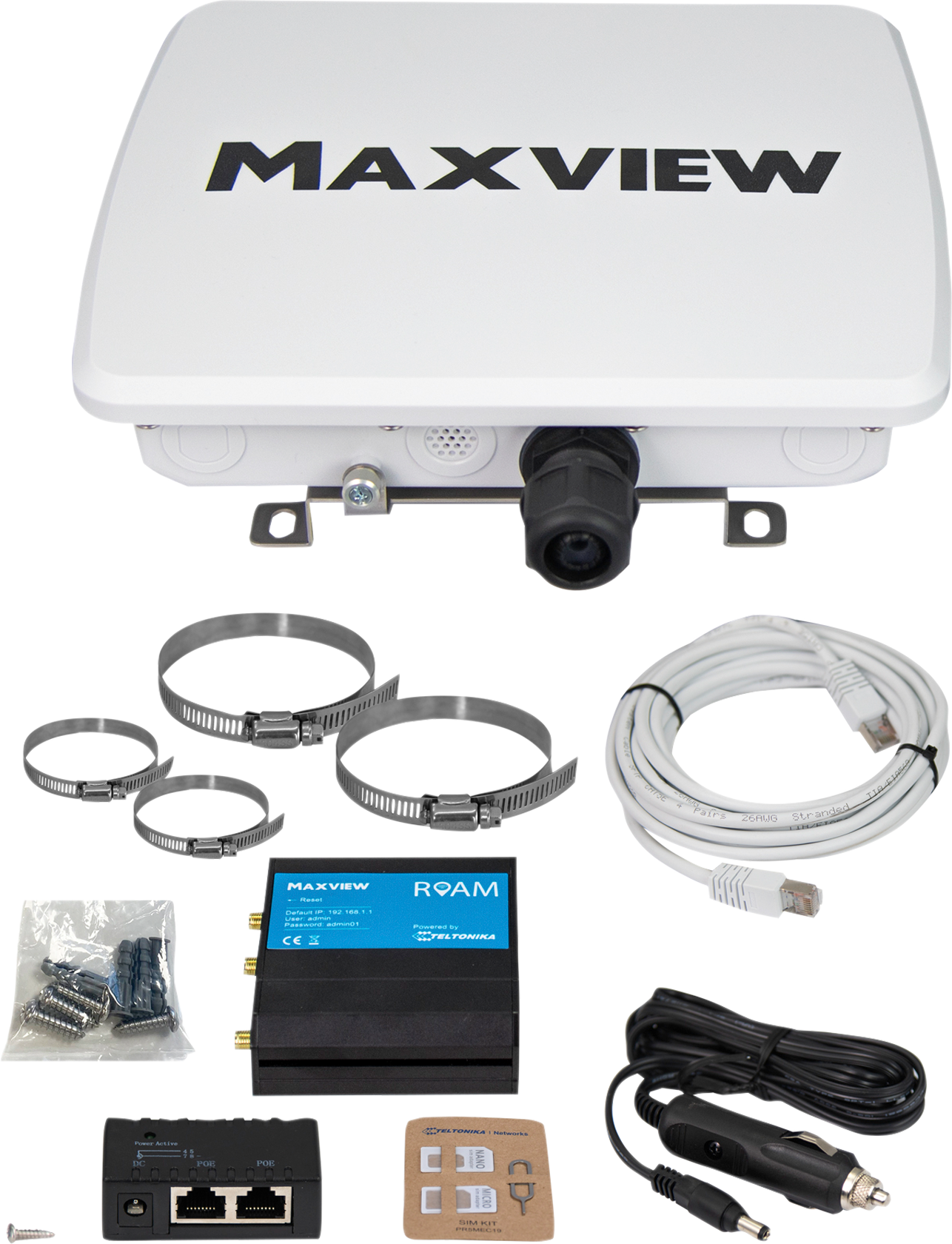 Maxview Roam-Basecamp – mobile Internet-Antenne Die neue Roam-Basecamp ist einen mobile Internet-Antenne ausgerüstet mit einem 4G CAT4 Router. Der Router befindet sich in der Antenne, somit werden Leitungsverluste verhindert. Die Antenne wird einfach ohne Montageaufwand neben dem Fahrzeug oder an dem Fahrzeug mit verschiedenen optionalen Befestigungen angebracht. Es wird kein zusätzliches Spannungsversorgungskabel zur Antenne benötigt. Der Router wird einfach über das Ethernetkabel mit einem PoE mit Strom versorgt. Der PoE ist im Lieferumfang enthalten. Details: * Integrierter Router: 4G CAT4 Router, befindet sich in der Antenne (Vermeidung von Leitungsverlusten) * Kein Montageaufwand nötig * Flexible Anbringung neben oder am Fahrzeug (mit optionalen Befestigungen) * Kein zusätzliches Stromversorgungskabel zur Antenne erforderlich * Stromversorgung über Ethernetkabel via PoE (im Lieferumfang enthalten) Technische Daten: * Antenne Typ: Omni-directional * 2 x Multi-band 4G/TE Antenna * 1 x Dual-band WiFi Antenna * Frequenz: 698-960 / 1710-2170 / 2300-2690MHz * Verstärkung: 6.1 dBi * Router-Typ: 4G (CAT4 LTE) * Kompatible Geschwindigkeiten: bis 150 Mbps 4G * Wi-Fi: MU-MIMO – 802.11.b/g/n – 2.4GHz * Gehäuse: Kunststoff * Nutzer-Geräte: Je nach Bandbreite u. Antennen-Typ * Spannung: 9-30 V DC (mit Verpolungsschutz) * 12 V Zigarrenanzünderstecker abgesichert * mit 2A Sicherung * Stromverbrauch: 0.4A max * Familienfreundliches Surfen: Ja, Black- und Whitelisten * Diagnose per Fernzugriff: Ja * SIM: Entsperrt (keine SIM-Karte im Lieferumfang) * Antenne Abmessungen: H: 220 B: 250mm T: 60mm * Antenne & Router Gewicht: 1102g Lieferumfang: * LTE-Antenne mit Halterung * Router (bereits vormontiert in der Antenne) * Ethernet-Kabel 5 m * PoE-Adapter (2 x RJ45) * 2 x große verstellbare Schlauchschelle * 2 x kleine verstellbare Schlauchschelle * 12 V Anschlusskabel 1,5 m * SIM-Karten Adapter * Befestigungen für die Wandmontage * Bedienungsanleitung Maße (LxBxH): 250 x 220 x 60 mm