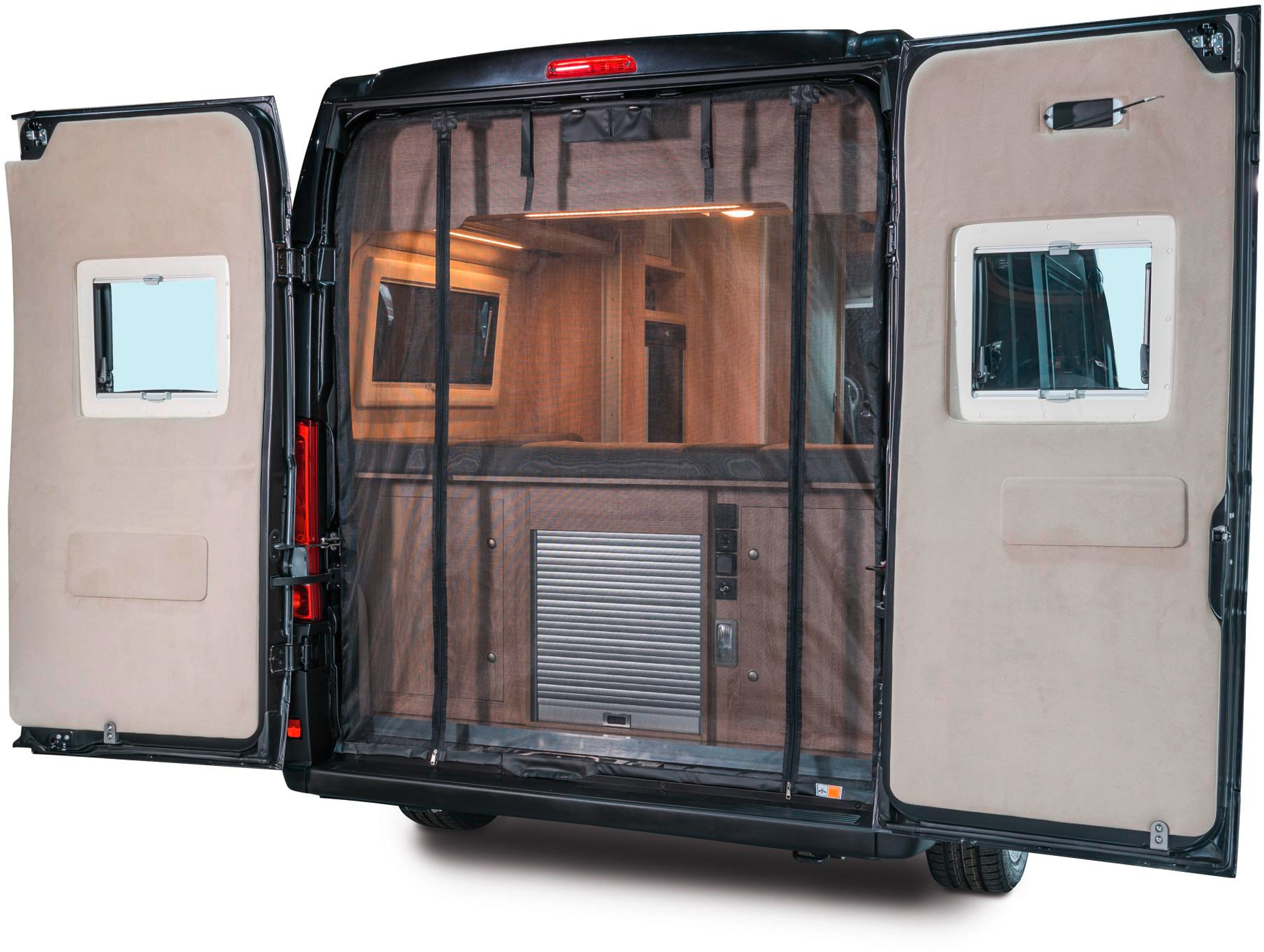 Heckmoskitonetz Fine-mesh H2 Mit diesem feinmaschigen Heckmoskitonetz schützt Du Dich zuverlässig vor Insekten und genießt gleichzeitig Frischluft und freie Sicht. Es passt ideal an viele H2-Modelle und lässt sich dank elastischem Einfassband und Magneten schnell montieren. Der Zugang zum Heck bleibt über den Reißverschluss komfortabel, auch bei Transportern mit oder ohne Ausbau. Details: * Passend für Fahrzeughöhe H2 mit Flügeltüren * Schnell montiert mit Magneten, Klett und elastischem Einfassband * Praktischer Zugang über Reißverschluss, aufroll- und fixierbar * UV- und witterungsbeständig, luftdurchlässig und schimmelresistent Technische Daten: * Maschenweite: Fine-mesh 0,94 x 0,94 mm, offene Fläche ca. 55 % * Material: Fiberglas mit polyvinylchlorid (PVC)-Beschichtung * Farbe: Schwarz * Geeignet für: Citroën Jumper Typ 250 (ab 2007), Fiat Ducato III Typ 250 (ab 2006), Opel Movano (ab 2021), Peugeot Boxer S2 (ab 2006), Toyota Proace MAX (ab 2024) Lieferumfang: * Moskitonetz * Klettstreifen * Reinigungstuch * Montageanleitung * Transporttasche Art Insektenschutz: Insektenschutz/Netz, Farbe: schwarz, Ausführung: Maschenweite Fine-mesh