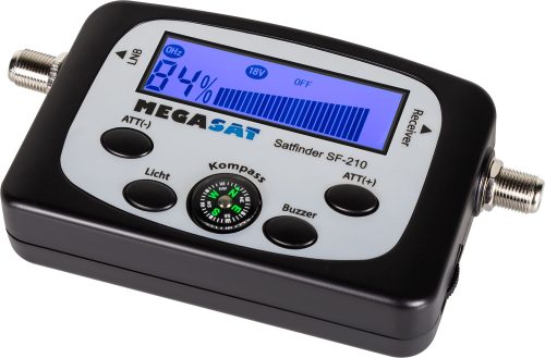 Satfinder zur einfachen Satellitensuche Der Satfinder erleichtert die Ausrichtung der Satellitenanlage durch akustische, optische und digitale Signalanzeigen mit Hintergrundbeleuchtung. Er verfügt über eine digitale Signalanzeige und einen Dämpfungsregler zur optimalen Feinjustierung. Ein akustisches Signal ertönt, wenn ein Satellit in Reichweite ist. Technische Daten: * Akustische und digitale Pegelanzeige (Prozentanzeige) * Digitales Display mit Hintergrundbeleuchtung (ein-/ausschaltbar) * Dämpfungsregler * Buzzer Funktion (akkustisches Signal bei gefundenem Satelliten) * Integrierter Kompass * DC Stromversorgung vom Receiver * Durchschleifung der LNB Versorgungsspannung (13-18 V DC) * Eingangssignal min.: -40 dBm * Eingangssignal max.: -10 dBm * Maße: (BxHxT) 128x68x26 mm * Gewicht: 98 g Lieferumfang: * Satfinder SF-210 * Bedienungsanleitung