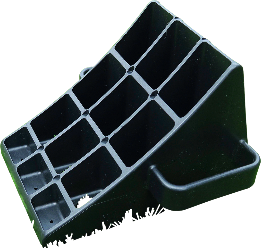 Ein extra breiter Unterlegkeil mit seitlichen Griffen, um die Gefahr des Einklemmens der Hände zu verringern. Diese sind mit den MGI-Keilnivellieren von Milenco kompatibel.