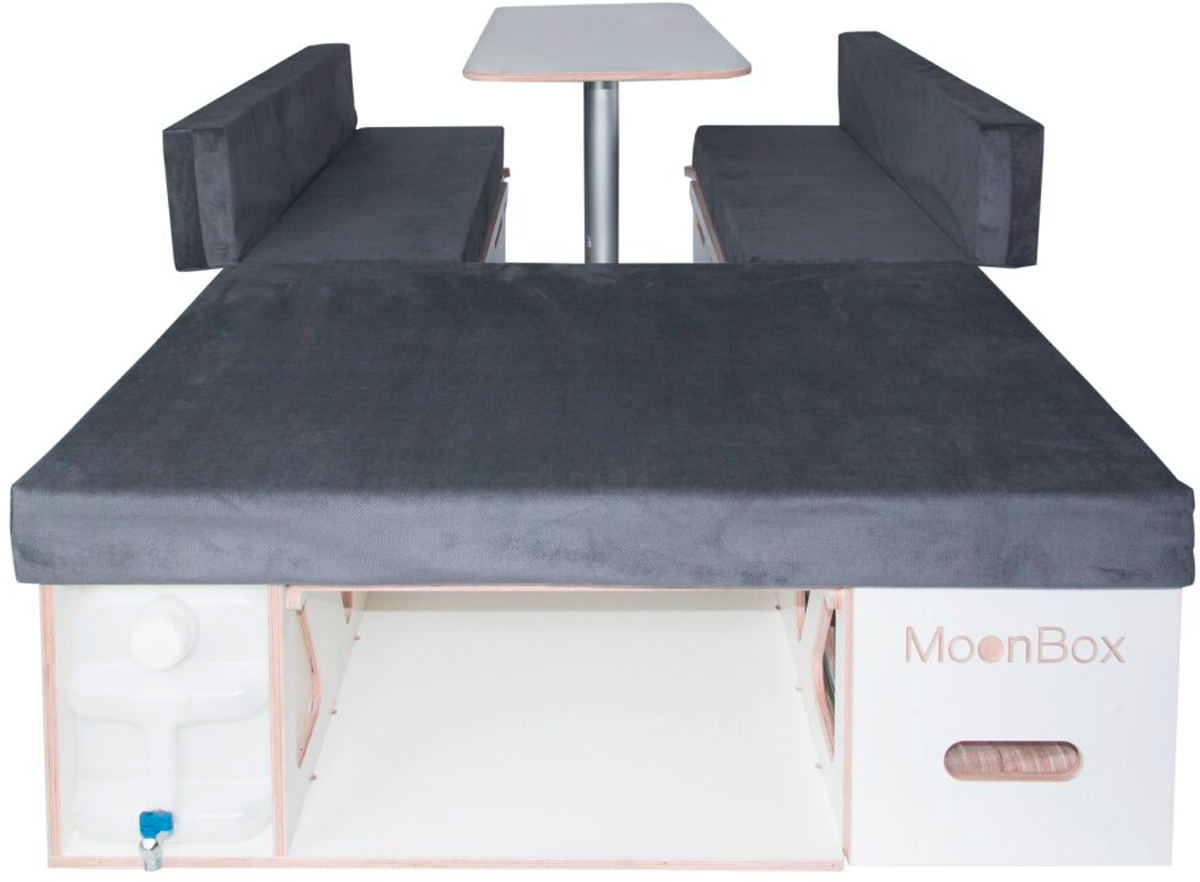 Moonbox Campingbox Van/Bus Typ 115 – dein Camper für mehr Freiheit Mit der Moonbox verwandelst du dein Fahrzeug in nur einer Minute in einen voll ausgestatteten Mini-Camper – egal wann, egal wo. Während der Fahrt nutzt du die praktischen Stauräume, am Ziel entsteht daraus wahlweise ein gemütliches Doppelbett mit bequemer Matratze oder eine komfortable Lounge mit Tisch, Sitzen, Küche und Wasserstation. Die Moonbox wird in Europa in unserer eigenen Fertigung hergestellt, besteht zu 100 % aus natürlichem Birkenholz, ist frei von Plastik und mit robusten Metallteilen verarbeitet. Dank des modularen Aufbaus lässt sie sich einfach tragen und montieren. Sie eignet sich für Fahrzeuge mit mindestens 115 cm Innenbreite und 200 cm Bodenlänge. Mit den 12 Füßen à 15 mm kannst du Höhenunterschiede im Fahrzeugboden ausgleichen – bei größeren Unebenheiten erhältst du auf Wunsch ein zusätzliches Set. Details * erhältlich in Natur, UV-Lack oder Weiß * verwandelt dein Fahrzeug in 1 Minute in Bett oder Lounge * modulare Bauweise für leichten Einbau und Transport * 100 % Birkenholz (Holz), Metallverschraubungen, kein Plastik * bequeme Schlafauflage mit strapazierfähigem Bezug * kompatibel mit vielen Van- und Busmodellen (Maße vorher prüfen) Technische Daten * Mindestbreite im Fahrzeug: 115 cm * Mindestbodenlänge: 200 cm * Maße Basisbox: 115 × 79 × 33 cm * Maße Seitenkästen: 34 × 120 cm * Maße Tischplatte: 44 × 120 cm * herausziehbare Tischplatte, zwei Tischbeine * 3-teilige Matratze: 119 × 200 cm, 10 cm dick * Matratzenbezüge abnehmbar, pflegeleicht, abrieb- und UV-beständig * Zwei-Brenner-Gaskocher mit automatischer Zündung, tragbar * Betrieb mit 227 g Standardkartuschen (2–3 Stunden pro Kartusche) * Wassertank mit 20 l Fassungsvermögen, Wasserhahn mit Regulierung * Gewicht: ca. 70 kg Kompatible Fahrzeuge * Peugeot Traveller L2, L3 * Citroën Spacetourer M, XL * Opel Zafira Life M, L * Toyota Proace Verso L1, L2 * Fiat Ulysse L1, L2 * sowie viele weitere Fahrzeuge mit ausreichenden Innenmaßen Lieferumfang * Basisbox * zwei Seitenkästen (Sitze) * Tischplatte mit zwei Tischbeinen * herausziehbare Tischplatte * Küchenschublade * 3-teilige Schlafauflage mit Bezügen * Zwei-Brenner-Gaskocher * 2 Gaskartuschen 227 g * Wassertank (20 l) mit Wasserhahn * 12 höhenregulierende Füße (15 mm) Art Campingbox: Campingbox für Busse und Vans, Ausführung: Weiß