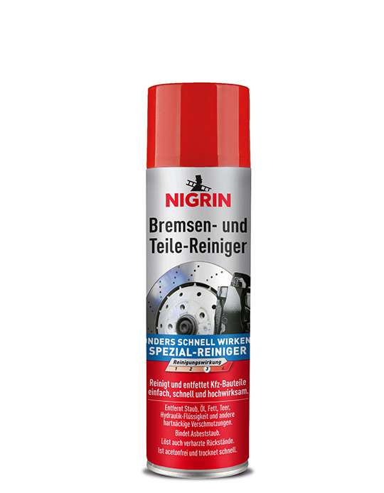 NIGRIN Bremsen- und Teile-Reiniger ist ein besonders schnell wirkender Spezial-Reiniger. Er reinigt und entfettet Brems-, Kupplungs-, Getriebe- und andere Kfz-Bauteile, Vergaser und Benzinpumpen mühelos, schnell und effektiv. NIGRIN Bremsen- und Teile-Reiniger entfernt durch spezielle Lösungsmittel auch hartnäckige Verschmutzungen wie Staub, Öl, Fett, Teer, Hydraulik-Flüssigkeit etc. Er wirkt acetonfrei und trocknet schnell. Er bindet Astbeststaub und löst auch verharzte Rückstände. Besonders schnell wirkender Spezial-Reiniger * Reinigt und entfettet Kfz-Bauteile einfach, schnell und hochwirksam * Entfernt Staub, Öl, Fett, Teer, Hydraulik-Flüssigkeit und andere hartnäckige Verschmutzungen * Bindet Asbeststaub * Löst auch verharzte Rückstände * Ist acetonfrei und trocknet schnell Anwendung von NIGRIN Bremsen- und Teile-Reiniger * Zu reinigende Bauteile mit NIGRIN Bremsen- und Teile-Reiniger einsprühen. * Wirkstoff ablaufen lassen. * Teile an der Luft trocknen lassen oder mit einem Tuch abwischen. * Bei hartnäckigen Verschmutzungen Vorgang wiederholen. * Hinweis: Nicht auf Lack, Gummi oder Kunststoffteile sowie auf Bremsschläuche oder elektrische Kontakte sprühen. Art Pflege/Reinigung: Reinigung, Füllmenge: 500 ml