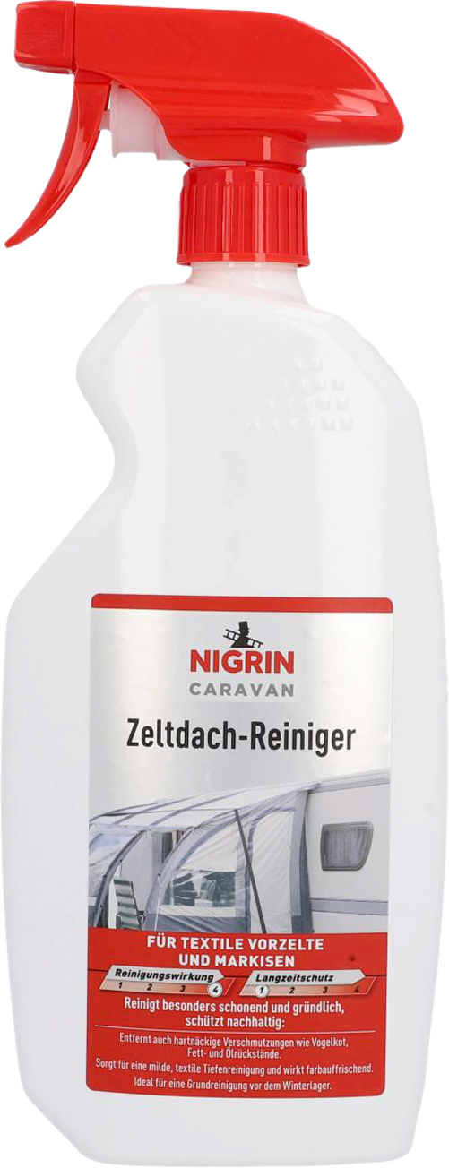 Der NIGRIN Zeltdach-Reiniger reinigt besonders schonend und gründlich textile Vorzelte und Markisen. Durch die Durchdringung des Gewebes wird eine Neuverschmutzung und Bildung von Stockflecken deutlich reduziert. Er frischt die Farben auf und beseitigt unangenehme Gerüche. Reinigt besonders schonend und gründlich textile Vorzelte und Markisen * Entfernt auch hartnäckige Verschmutzungen wie Vogelkot, Fett- und Ölrückstände und sogar Stockflecken. * Sorgt für eine milde, textile Tiefenreinigung und wirkt farbauffrischend. * Hemmt die Neuverschmutzung und Bildung von Stockflecken. * Beugt vorzeitiger Alterung und Verwitterung nachhaltig vor. * Eignet sich auch ideal für die Grundreinigung vor dem Winterlager. Anwendung von NIGRIN CARAVAN Zeltdach-Reiniger * Vorzelt oder Markise zuvor gründlich mit Wasser abspülen. * Reiniger direkt auf verschmutzte Stellen aufsprühen. * Mit NIGRIN Universal-Schwamm oder weicher Bürste sanft behandeln – dabei zu hohen Druck vermeiden, damit der Schmutz nicht in die Fasern gedrückt/gerieben wird. * Bei Über-Kopf-Arbeiten Reiniger auf einen feuchten Schwamm aufsprühen, Produkt aufschäumen und verschmutzte Fläche säubern. * Anschließend mit klarem Wasser nacharbeiten und gründlich abspülen. * WICHTIG: Für lang anhaltenden Schutz das Vorzelt oder die Markise anschließend mit NIGRIN Caravan Zeltdach-Imprägnierer versiegeln. * Hinweis: Vor Gebrauch an einer unauffälligen Stelle auf Materialverträglichkeit prüfen. Vor Frost schützen. Art Pflege/Reinigung: Reinigung, Füllmenge: 750 ml, Maße (LxB): x cm, Maße (LxB): x cm