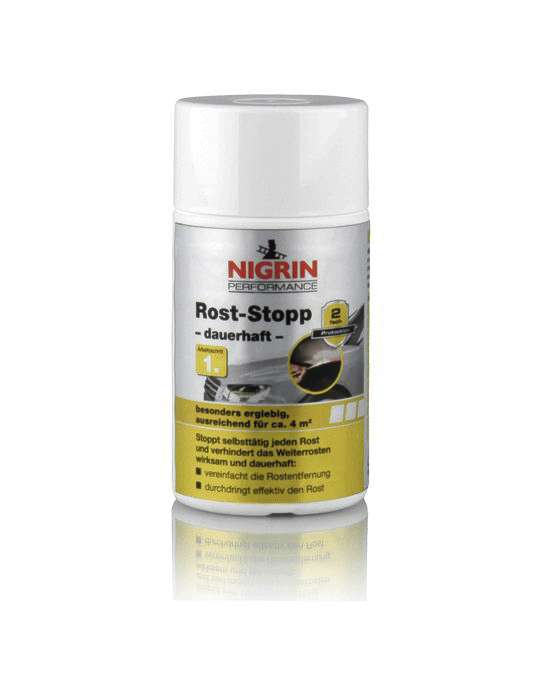 NIGRIN Rost-Umwandler reduziert Ihren Arbeitsaufwand, denn er arbeitet selbsttätig und passiviert Rost durch chemische Reaktion. Eine arbeitsintensive, mechanische Rostentfernung ist nicht erforderlich. NIGRIN Rost-Umwandler wirkt zuverlässig – Rost wird durch Säure gelöst und reduziert. Durch chemische Reaktion bildet sich eine feste Schutzschicht, die vor Sauerstoff und damit einem Weiterrosten schützt und als Haftgrund für alle weiteren Arbeiten dient. Besonders ergiebig, ausreichend für ca. 4 m² * Stoppt selbsttätig jeden Rost und verhindert das Weiterrosten wirksam und dauerhaft * Vereinfacht die Rostentfernung * Durchdringt effektiv den Rost Anwendung von NIGRIN Rost-Stopp „dauerhaft“ * Oberflächensäubern, losen Rost entfernen. * NIGRIN Rost-Stopp gut aufrühren und mit Pinsel auftragen. * Nach kurzer Zeit zeigt sich eine schwarze Verfärbung, die den elektro-chemischen Prozess anzeigt. * Nach 3 Stunden ist der Rost völlig gestoppt und die Schadstelle kann weiter bearbeitet werden. Produktsicherheit * Verursacht Hautreizungen. * Verursacht schwere Augenreizung. Art Pflege/Reinigung: Pflege, Füllmenge: 200 ml