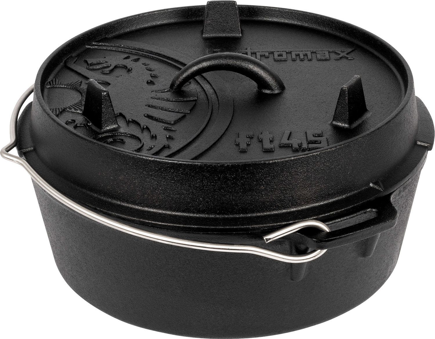 Der originale Petromax Feuertopf, oft auch als Dutch Oven bezeichnet, eignet sich ideal für das Kochen und Backen im Freien oder im heimischen Backofen. Mit ihnen garen Speisen, wie z. B. Fleisch und Gemüse, sehr schonend im eigenen Saft über offenem Feuer, im heimischen Backofen sowie auf allen Herdarten (nur die Töpfe ohne Füße). Die Deckel der Feuertöpfe können zudem auf Wunsch als Servierplatte oder Pfanne genutzt werden. Dank der vorbehandelten Oberfläche ist der robuste Petromax Feuertopf aus Gusseisen sofort verwendbar. Gusseiserne Töpfe existieren seit dem 18. Jahrhundert. Schon damals schätzte man die einzigartigen Eigenschaften des Gusseisens. Mit dem Feuertopf knüpft Petromax an diese Tradition an und stattet den Feuertopf außerdem mit einer Vielzahl an raffinierten Details aus. Details * Durch vorbehandelte Oberfläche sofort einsetzbar und einfach zu pflegen * Schonende Zubereitung aller Speisen * Einkerbung am Henkel für sicheres Aufhängen am Lagerfeuer * Feuertöpfe können übereinander gestapelt werden * Feuertöpfe verfügen über planen Boden sowie Füße am Deckel (außer ft1) * Optimale Hitzeverteilung durch spezielle Oberflächenstruktur * Thermometerdurchführung im Deckel * Einzigartiger Geschmack durch konstante Rundumwärme im Topf * Deckel des Feuertopfs auch als Pfanne oder Servierteller einsetzbar Inhalt * ft1-t: Inhalt Topf (max.): 0,93 l Inhalt Deckel (max.): 0,25 l * ft4.5-t: Inhalt Topf (max.): 3,5 l Inhalt Deckel (max.): 1 l * ft12-t: Inhalt Topf (max.): 10,8 l Inhalt Deckel (max.): 2 l * ft18-t: Inhalt Topf (max.): 16,1 l Inhalt Deckel (max.): 2,7 l Lieferumfang Feuertopf planer Boden (Dutch Oven), Gebrauchsanleitung (Deutsch/Englisch/Französisch) Material: Gusseisen, Ausführung: ft4.5, für 2-5 Personen, Durchmesser: (Boden außen) 22 cm, Gewicht: 7,7 kg, Höhe: (ohne Deckel) 9,1 cm