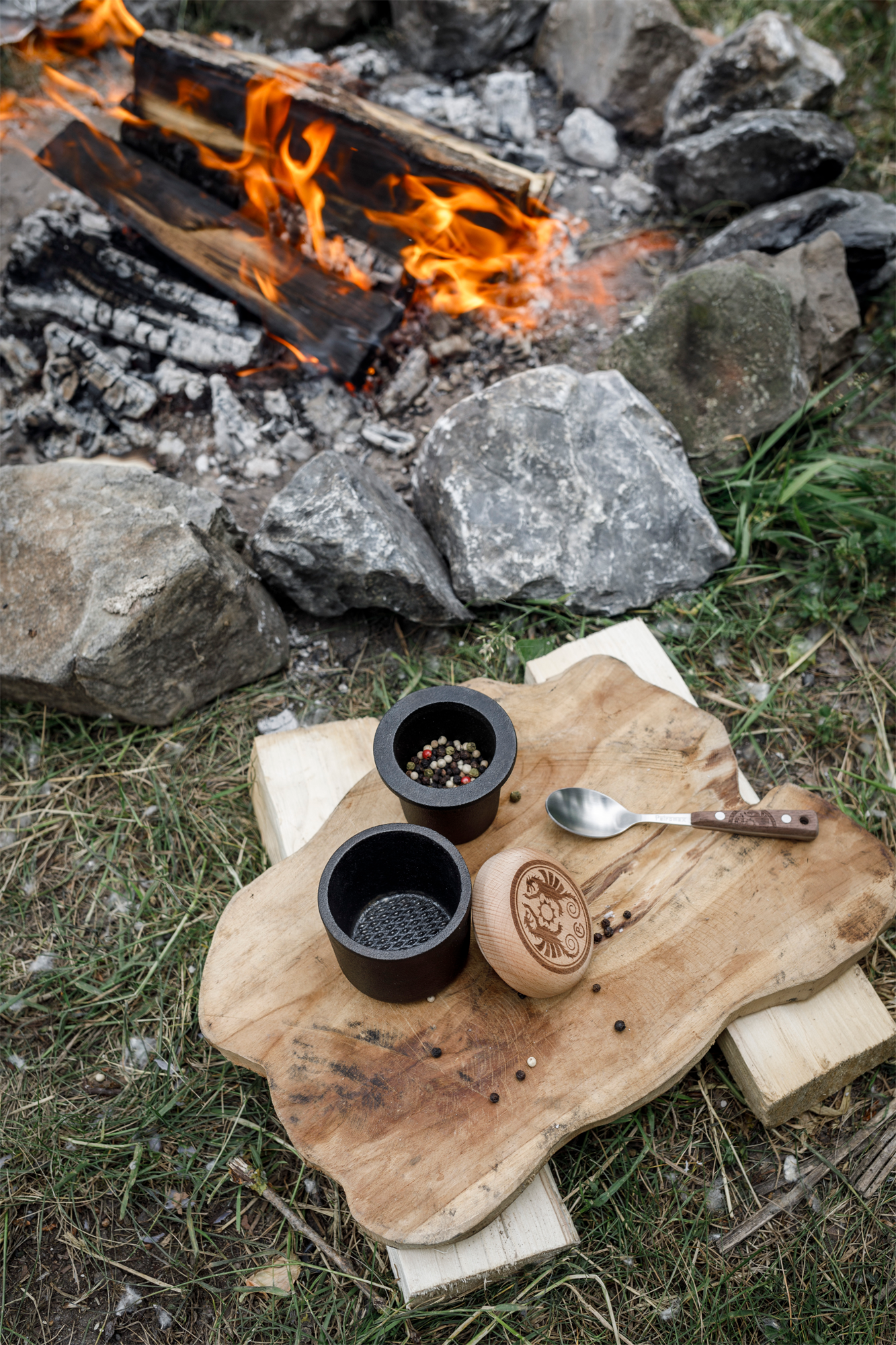 Petromax Handmörser aus Gusseisen – Frische Aromen für deine Outdoor-Küche Mit dem Petromax Handmörser aus Gusseisen mahlst du Gewürze, Nüsse und Samen mühelos direkt am Feuer. Durch das hohe Eigengewicht von Mörser und Stößel aus Gusseisen genügt schon eine leichte Drehbewegung, um den Mahlgrad von grob bis fein individuell zu bestimmen. Die Riffelungen im Unterteil und am Stößel unterstützen dich dabei und ermöglichen alle Mahlgrade – von grobem Pfeffer mit intensiver Textur bis hin zu feinem Gewürzpulver mit kräftigem Duft. Im Oberteil mit Dichtungsring aus Silikon kannst du deine individuell gemischten Gewürze aromadicht aufbewahren. Der Holzdeckel aus Holz mit Drachenlogo im Petromax Design verleiht dem Mörser einen markanten Look. Das robuste Material sorgt für angenehme Haptik, Langlebigkeit und erleichtert dir die Arbeit durch sein Gewicht. Zur Reinigung spülst du den Mörser einfach mit Wasser ab und lässt ihn gut trocknen. Bei Bedarf kannst du einen Ringreiniger verwenden, um Rückstände zu entfernen. Kompakt, vielseitig und kraftvoll unterstützt dich der Handmörser bei jeder würzigen Kreation in der Draußen-Küche. Details * Handmörser und Stößel aus Gusseisen * Mahlen mit geringem Kraftaufwand * Individuell einstellbarer Mahlgrad von grob bis fein * Riffelungen im Unterteil und am Stößel * Oberteil mit Dichtungsring aus Silikon zur Aufbewahrung * Robustes, schweres Material für angenehme Haptik * Ideal für Gewürze, Nüsse und Samen * Kompakte Bauweise für die Outdoor-Küche Technische Daten * Material: Gusseisen, Holz, Silikon * Maße (H x B x T): 8,6 x 7 x 7 cm * Gewicht: ca. 1100 g * Füllmenge Oberteil: max. 65 ml Lieferumfang * 1 x Unterteil * 1 x Stößel / Oberteil zur Aufbewahrung der Gewürze * 1 x Holzdeckel mit Dichtungsring Material: Gusseisen