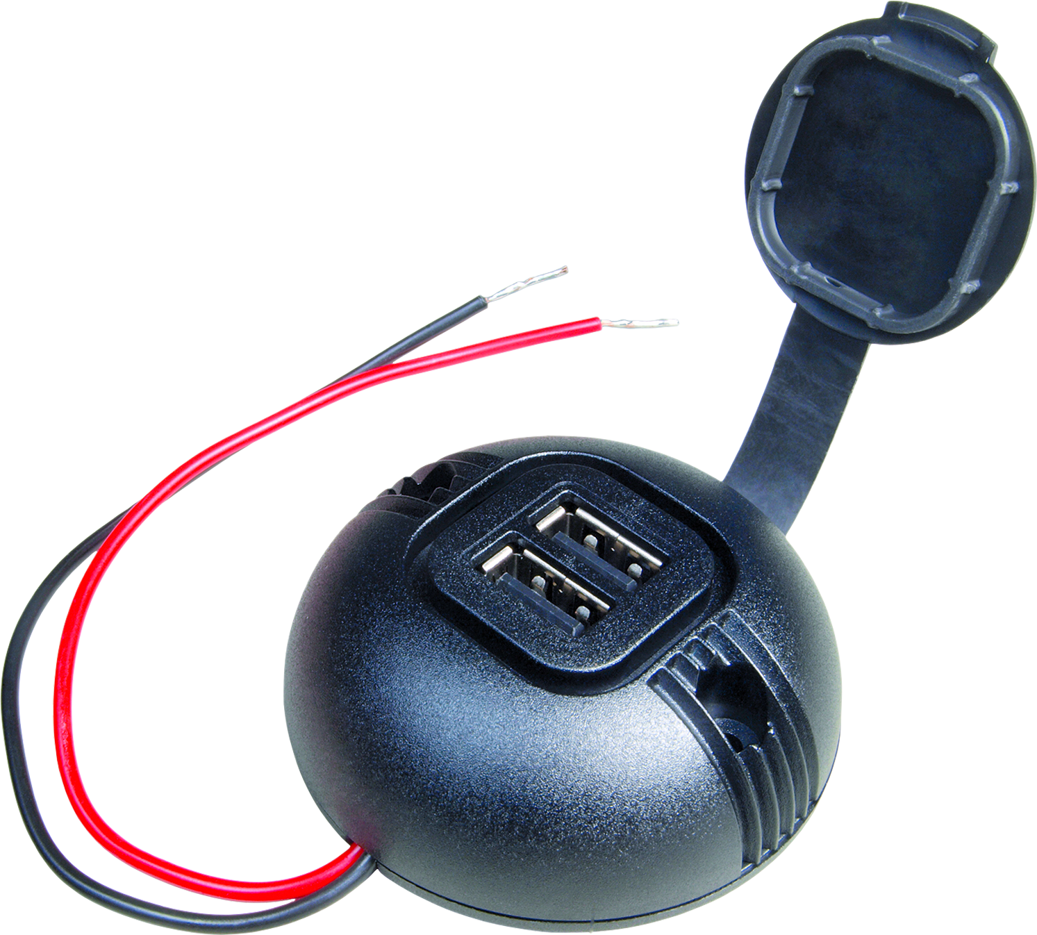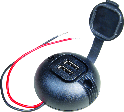 Runde Aufbau Power USB Doppelsteckdose mit Deckel Eingangsspannung: 8 – 34 Volt DC Ausgangsspannung: 5 Volt DC an 2 x USB-A Ausgangsstrom max.: 5 A (2 x 2,5 A) Stromaufnahme: < 3 mA (Leerlauf) Schutz bei: Kurzschluss, Überlast , Überspannung und Übertemperatur Anschlüsse: Kabelenden 6mm verzinnt Material: Gehäuse: Polycarbonat Temperaturbelastung: max. 135 °C Deckel: TPE Evoprene 971 sw. 83 Shore A Kabel: Litzenkabel: 2 x 0,5 mm² rot/schwarz Länge: 160 mm Art Kabel, Kupplung, Schalter und Stecker: Stecker, Farbe: Schwarz
