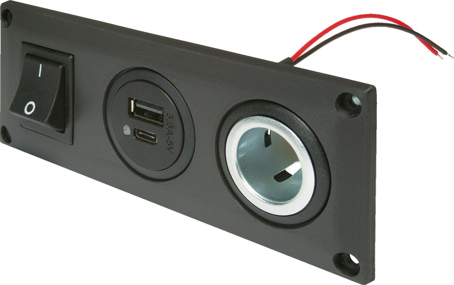 Einbausteckdose mit 1 USB Steckdose, schaltbar und 1 Powersteckdose Die Steckdose (12-24 Volt) kann mittels beiliegender Schrauben befestigt werden. Der Kabelanschluss wurde vorkonfektioniert. Bei einem Zuleitungsquerschnitt von 2,5 mm², max. 20 A bei einem Zuleitungsquerschnitt von 1,5 mm², beträgt die maximale Belastbarkeit 16 A. Der Innen-Ø der Steckdosen beträgt 21 mm und ist passend für Universalstecker. Die USB-Steckdose hat einen integrierten Spannungswandler mit Ausgang 5 V DC, Input 8-34 V, E1-Zulassung, Überlastschutz, Übertemperaturschutz und Verpolungsschutz. Die Einbautiefe beträgt 55 mm. Die Version „mit USB-C/A Doppelsteckdose“ hat 3,6 A, eine blaue LED, zusätzlichen Schutz vor Kurzschluss und Überspannungsschutz bei kurzen Spannungsspitzen. Die Version „mit USB-A Doppelsteckdose“ hat 5 A Art Kabel, Kupplung, Schalter und Stecker: Steckdose, Ausführung: mit USB- C/A Doppelsteckdose, Maße (LxBxH): 144 x 56 x 7 mm