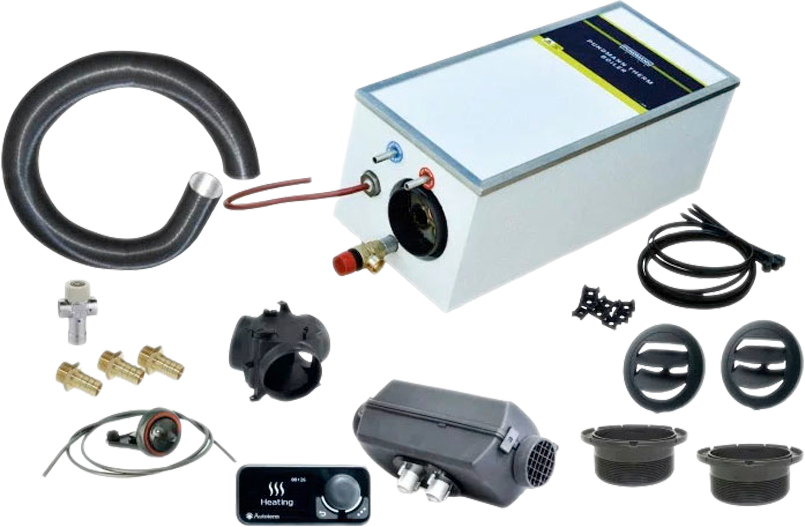 Das Warmduscher-Set besteht aus: * Pundmann Therm Boiler 6 Air 12V 200W / Pundmann Therm Boiler 9 Air 12V 200W (Je nach Ausführung) * Autoterm AIR 4D * Autoterm Comfort Control * 3M Warmluftschlauch 90 mm * Y Stück mit Klappe 90 mm * Bowdenzug * 2x Ausströmer 90 mm * 2x Verschießbarer Ausströmer 90 mm * 1x Mischventil * 3x Schlauchtüllen Die Autoterm Air 4D (ehemals Planar 44D) in 12V mit einer Heizkraft von 4KW sorgt auch bei eisigen Temperaturen für ein schnelles Aufheizen des Innenraums. Sie eignet sich für größere Fahrzeuge (z.B. Mercedes Sprinter) und Boote. Die optimale Raumgröße, in welcher die Autoterm Air 4D am effizientesten arbeitet, beträgt laut Hersteller 40 m³. Die Autoterm Air 4D 4KW 12V verfügt wie alle Standheizungen der Marke Autoterm über ein ECE-Prüfzeichen, so dass sie eintragungsfrei verbaut werden kann. Technische Daten * Volumen: 6 Liter / 9 Liter (je nach Ausführung) * Kraftstoffsorte: Diesel * Spannung: 12V * Maximale Heizleistung: 4 KW * Minimale Heizleistung: 1 kW * Maximaler Wirkungsgrad der Luftheizung: 120 m³/h * Minimaler Wirkungsgrad der Luftheizung: 70 m³/h * Maximaler Kraftstoffverbrauch in Modi: 0,514 l/h * Minimaler Kraftstoffverbrauch in Modi: 0,12 l/h * Maximale Leistung in Modi: 62 W * Minimale Leistung in Modi: 10W Stromaufnahme: 12 V, Volumen: 9 l