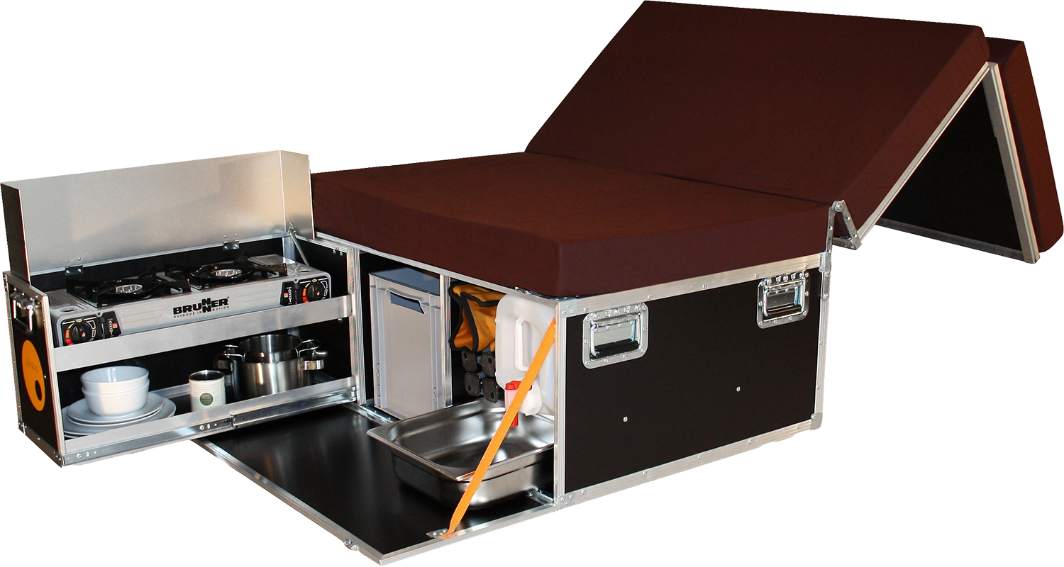 Wegen der kompakten Außenmaße und dem hohen Innenraum sind Hochdachkombis die ideale Basis für alltagstaugliche Minicamper. Hierzu wird die KombiBox einfach in den Kofferraum gestellt und schon ist alles Wesentliche für die Reise an Bord: Bett, Küche, Wasserversorgung und Stauraum. Das komplette System ist eine kompakte Einheit. So kann man nichts vergessen und der Einbau ist in einer Minute erledigt. Die Küche ist in wenigen Sekunden einsatzbereit und das bequeme Bett mit einem Handgriff ausgeklappt. So kann man in vollen Zügen den Urlaub genießen und entspannt flexibel reisen. In der Regel können dann beim kurzen Radstand jedoch keine Personen mehr auf der Rücksitzbank sitzen. Sollte eine 3. Sitzreihe im Fahrzeug vorhanden sein, muß diese ausgebaut werden. Details * 2-flammiger Kocher mit Windschutz * 10 cm dicke Kaltschaummatratze * In Sekunden ist das Bett ausgeklappt, egal ob mit oder ohne Rücksitzbank * Die Klappsegmente werden an den Sicherheitsgurthaltern aufgehängt * Das komplette System ist eine kompakte Einheit ohne lose Einzelteile * Die Box wird mit einem Spanngurt fixiert der sicher 500 kg hält * Der Kocher ist nicht fest verbaut kann aus der Schublade genommen werden, die Kanister lassen sich einfach entnehmen und befüllen. Lieferumfang Campingbox, Kochschublade, Windschutz, 2-Flammen Gaskartuschen Kocher, 2 Gaskartuschen, 2 Kanister à 10 l mit 1 Ablasshahn, 2 Edelstahl Schüsseln, Klappbett (trägt 180 kg) mit Gurtschlaufen (werkzeuglos verstellbar), Hochwertige Kaltschaummatratze, 10 cm Stärke, 3-teilig, Spannbezüge, 3-teilig, 100% Baumwolle, Zurrgurt 500 daN Maße: Box+Bett eschlossen: B110xT96xH80 cm Liegefläche: 110×195 cm Abmessungen Verpackung: B 120 x T 80 x H 140 Welche Variante für Ihr Fahrzeug geeignet ist, entnehmen Sie bitte dem PDF „Passende Fahrzeugmodelle“ unter dem Punkt Informationen und Downloads ! Art Campingbox: Campingbox mit Bett für Kombis & SUVs, Belastbar bis: 180 kg, Gewicht: 60 kg, Liegefläche (LxB): 195 x 110 cm, Maße geklappt (LxBxH): 106 x 76 x 42 cm, Ausführung: Kombibox 2, Farbe: braun