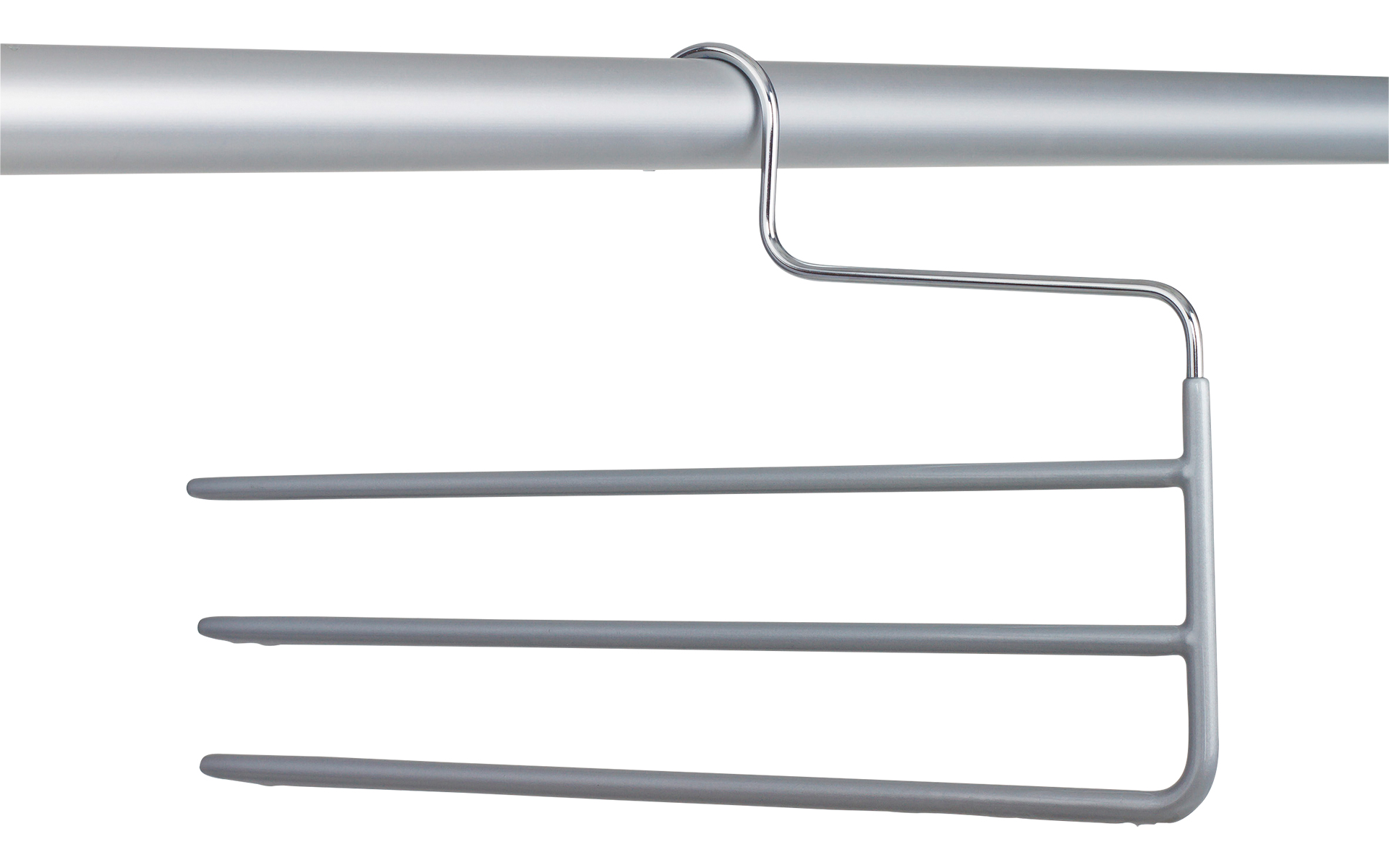 Bietet 3 Hosen auf geringstem Raum Platz. Hergestellt aus kräftigem, 5 mm starkem Stahldraht, verchromt. Der Bügel ist mit einem grauen Antirutsch-Belag beschichtet. Maße (LxH): 33 x 25,5 cm, Material: Stahldraht, verchromt, Farbe: grau, silber