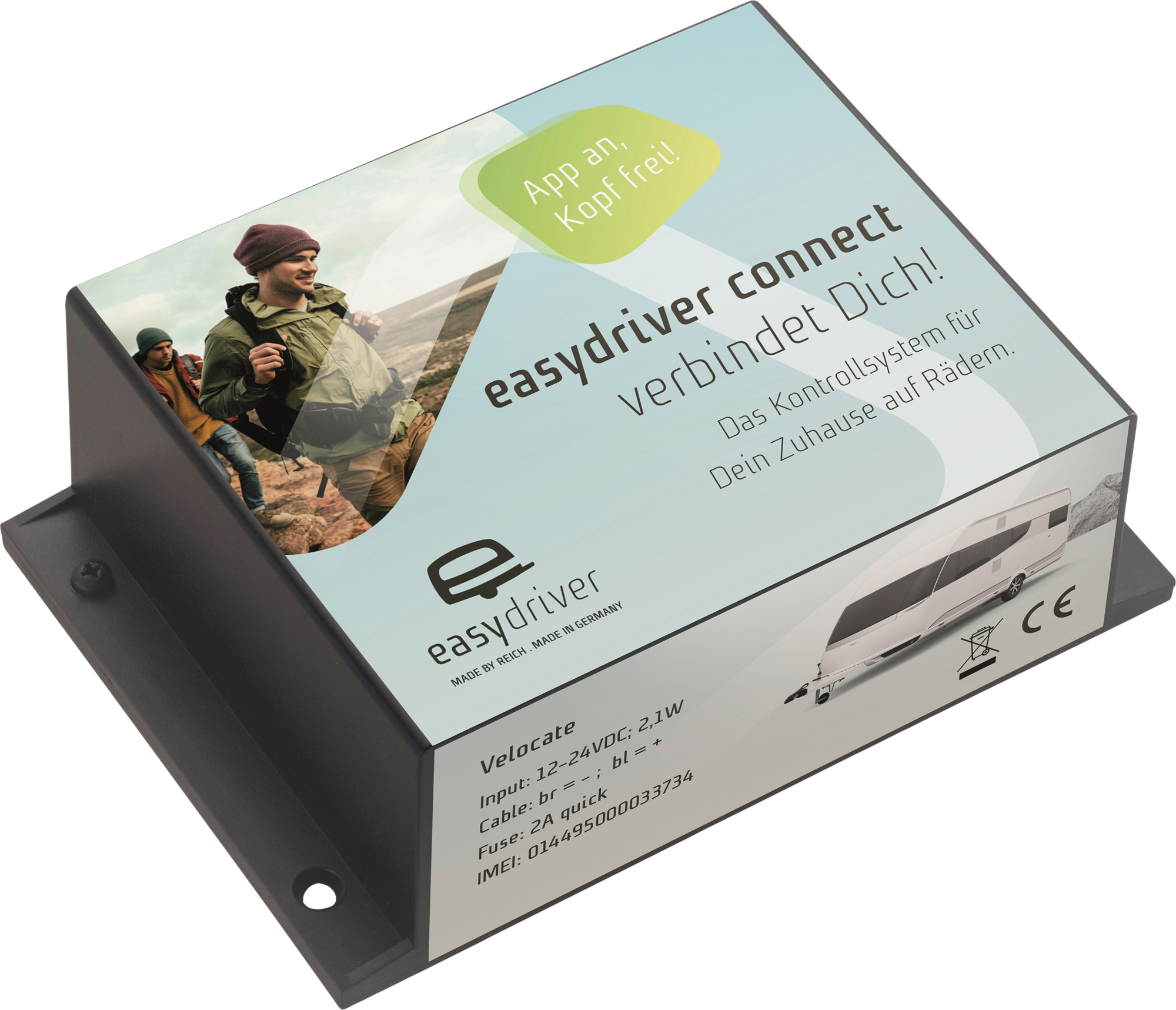 Reich easydriver connect Grundgerät Vernetzungsmodul Erlebe mehr Freiheit und Sicherheit auf Reisen mit dem easydriver connect Grundgerät. Dieses smarte Kontrollsystem für Wohnwagen und Wohnmobile ermöglicht es dir, dein Zuhause auf Rädern jederzeit und überall zu überwachen – bequem über die App. Details: * GPS-Ortungssystem für Echtzeit-Positionsermittlung * Diebstahlschutz mit Sicherheitszonensystem * Assistance Service zur Diebstahlsicherung mit Polizeiunterstützung * Überwachung wichtiger Fahrzeugdaten (z. B. Temperatur, Tankinhalt) via App * Erweiterbare Sensoren zur Fahrzeugkomponentenüberwachung * Mehrere Fahrzeugprofile und Verbindung zum elektronischen Stabilisierungssystem Technische Daten: * Maße: 8,9 x 4,8 x 13 cm (B x H x T) * Gewicht: 7,0 kg * Batterietyp: Lithium Lieferumfang: * 1x easydriver connect Grundgerät Vernetzungsmodul Art Sicherheitszubehör: Überwachungssystem