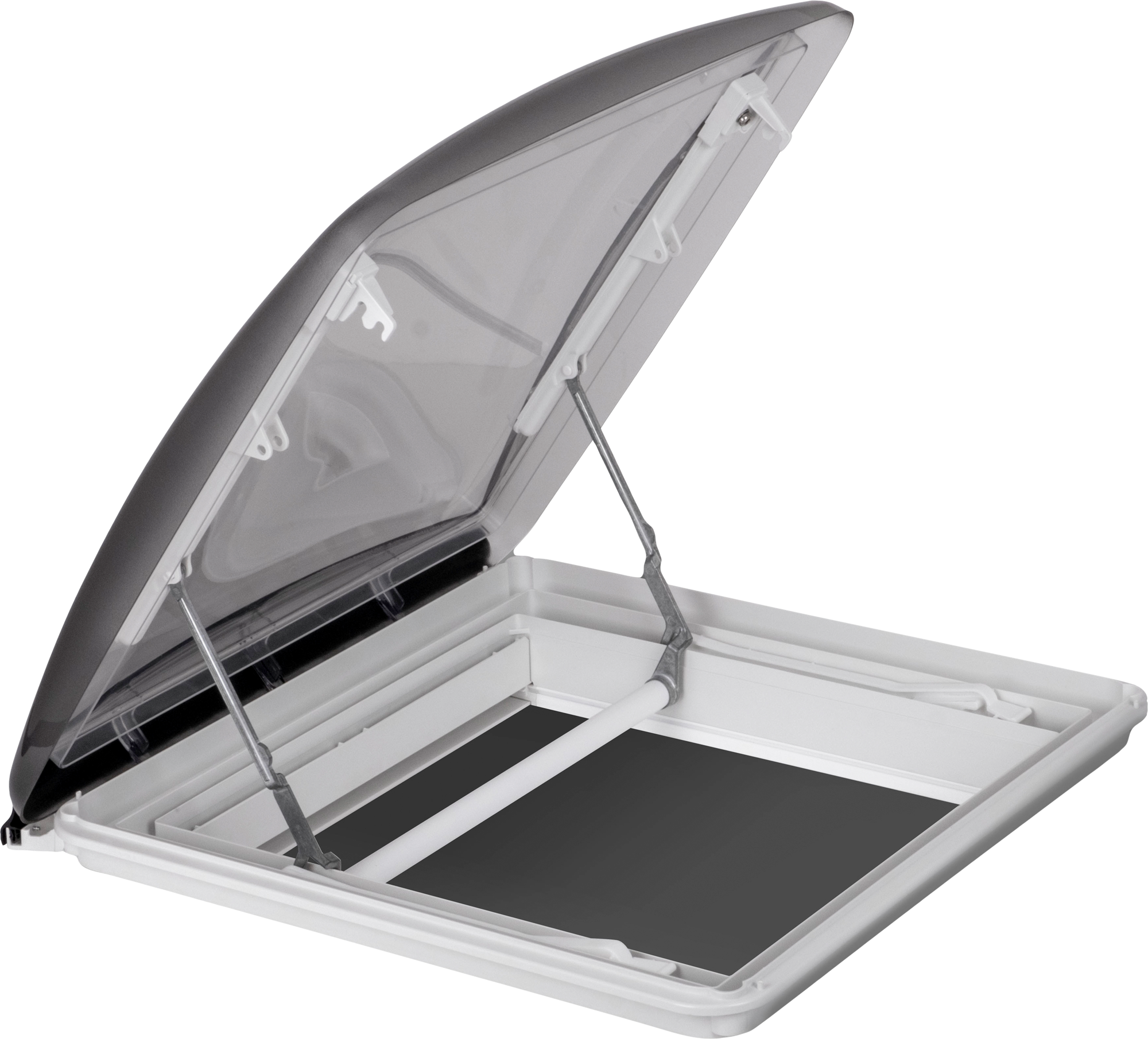 RoofSTAR: Eine neue Dimension von Dachhauben für Freizeitfahrzeuge Die roofSTAR Dachhauben wurden speziell entwickelt, um den höchsten Ansprüchen gerecht zu werden. Sie kombinieren ein völlig neuartiges, innovatives Design mit gleichzeitiger Gewichts-Ersparnis. Das extrem flache Design verbessert zudem erheblich die Aerodynamik, den Wind-Widerstand und die Geräusch-Entwicklung während der Fahrt. Produkteigenschaften: * Extrem flach: Die Außenhöhe wurde um 50% reduziert auf nur noch 72 mm * Besonders leicht: Das Gewicht insbesondere bei der roofSTAR-7 wurde um bis zu 2 kg reduziert. * Einzigartig: Für die Abmessung 400 x 400 mm ist mit unserer roofSTAR-4 erstmals eine motorisierte Variante erhältlich. * Clever konzipiert: Die Bedienung der motorisierten Ausführung erfolgt für beide Modelle über einen Schalter, der direkt im Rahmen integriert und somit sehr gut erreichbar ist. * Mit Beleuchtung: Für beide Modelle roofSTAR-4 und roofSTAR-7 bieten wir eine hochwertige, homogene LED-Beleuchtung. * Besonders stabil: Beide Ausführungen bestehen aus bewährtem UV-beständigem ASA und PMMA-Material. * Mitgedacht: Erstmal ist in der motorisierten Version ein zusätzlicher, permanent wirkender Fliegenschutz integrierbar! (Option) * Effektive Verdunklung: Beide roofSTAR Modelle haben ein Rollo-System integriert, welches eine effektive Verdunklung bietet und einfache Handhabung garantiert. * Äußerst montagefreundlich: Großzügig dimensionierter Dichtkanal zur Aufnahme der Dichtmasse und somit Verhinderung von Wasser-Eintritts-Problemen. 8 Befestigungs-Klammern ermöglichen den Einbau in einer Dachstärke von 25-45 mm. * Flexibel: Die roofSTAR-4 und roofSTAR-7 können einfach nachgerüstet und jeweils mit oder ohne Zwangsbelüftung geliefert werden. * Alltagsfreundlich: Auch an die einfachen Handgriffe im Alltag wurde gedacht, so dass der Innen-Rahmen der roofSTAR Dachhauben für eine schnelle Reinigung einfach zu entfernen und wieder zu befestigen ist. * Wasser-Management: Viel Zeit wurde in das effektive Wasser-Ablauf-System investiert, um den Schwallwasser-Eintritt in das Fahrzeug zu verhindern. * Spoiler-Wirkung: Dasselbe gilt auch für die standardmäßige Gummi-Dicht-Lippe an der Scharnierseite, die auch effektiv Geräusche minimiert („Spoiler-Wirkung“). Aufstellwinkel bis: 60 °, Ausschnitt Breite: 400 mm, Ausschnitt Länge: 400 mm, Farbe: RAL 9003, Gewicht: 3,5 kg, Ausführung: manuell mit ZWE, Dachstärke von: 25 mm, Dachstärke bis: 45 mm, Zwangsentlüftung: Ja
