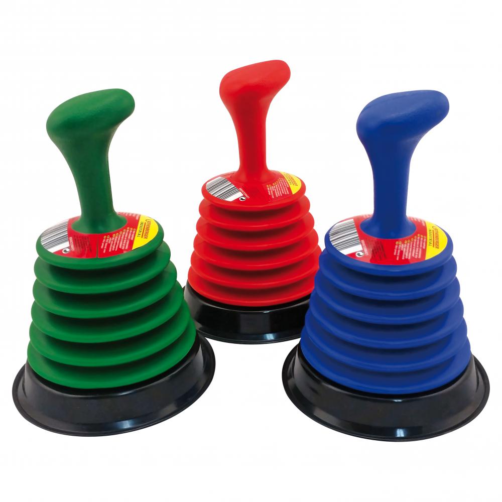 Die Kleine mit dem großen Hubraum. Für schnelle Beseitigung von Verstopfungen bei Abflüssen in Haushalt und Gewerbe. Pulsierende Anwendung löst die Verstopfung und spült den Abfluss frei. Bauhöhe 16 cm, flexibel mit zusätzlicher Dichtlippe! Anwendbar für alle gängigen Abflüsse bei Spülen, Duschtassen, Waschbecken und Badewannen. Artikel wird farbig sortiert geliefert. Eine Vorauswahl von Farbe/Muster/Modell ist bei der Bestellung nicht möglich. Farbe: sortiert, Breite: 12 cm, Höhe: 15 cm, Länge: 12 cm