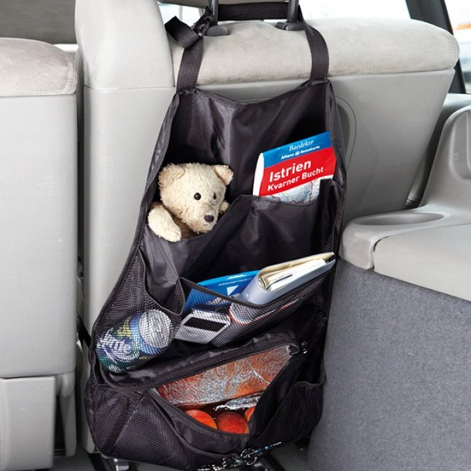 Ideal zum Aufbewahren von Spielutensilien, Essen und Allem was sonst noch während der Autofahrt benötigt wird. Großes Kühlfach mit Reißverschluss, 1 große Tasche mit Klettverschluss, 3 Getränkehaltetaschen, 2 große Netztaschen. Einfache Befestigung mittels Haltegurt. Material: 100 % Polyamid, AZO-frei. Waschbar. Farbe: schwarz, Maße (LxB): 60 x 40 cm