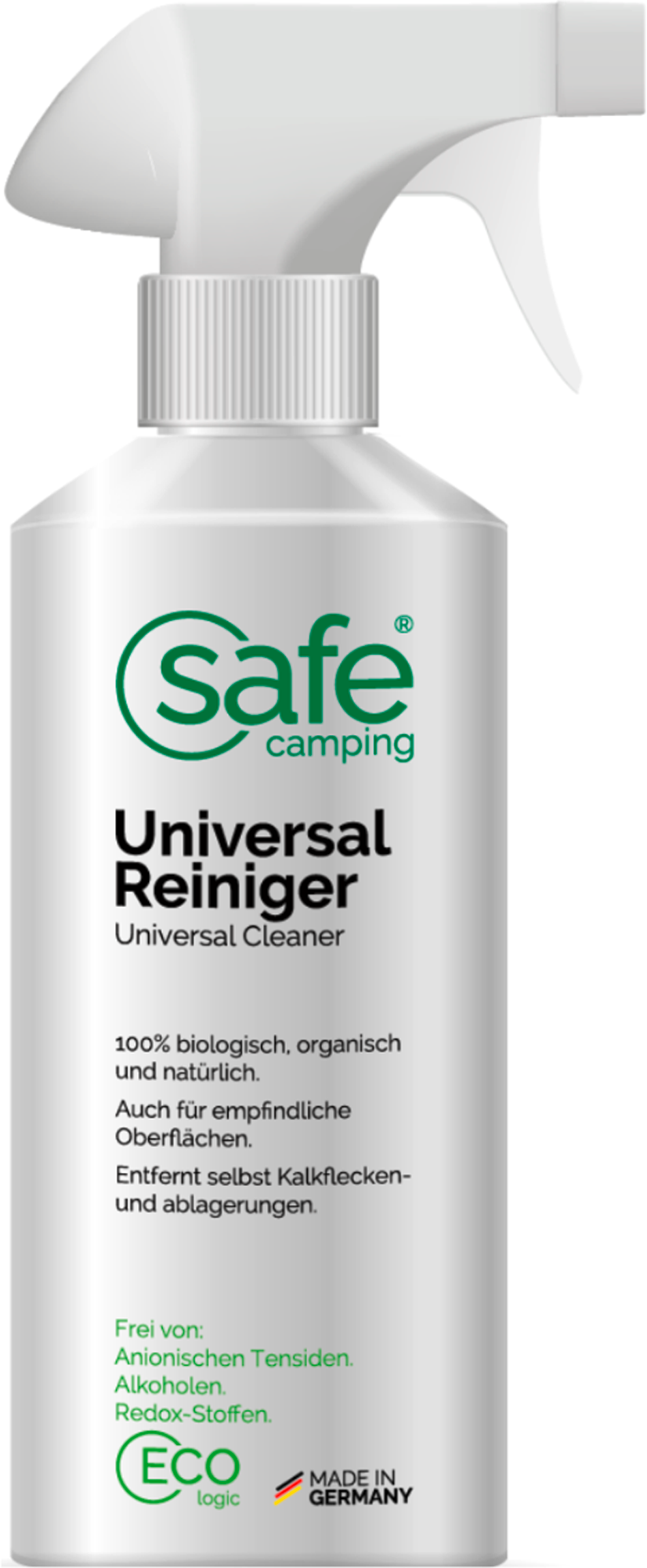 Safe Camping Universal-Reiniger – Rückstandsfreie Reinigung mit Schutzfilm Mit dem Safe Camping Universal-Reiniger entfernst du allgemeine Verschmutzungen im Innen- und Außenbereich von Fahrzeugen, Vorzelten und Anbauten rückstandsfrei und besonders materialschonend. Er beseitigt zuverlässig Öl-, Fett- und Mineralverschmutzungen, entfernt Kalkablagerungen und Kalkflecken an Armaturen und Einbauteilen, bildet einen Mikro-Schutzfilm und beugt erneuten Verschmutzungen vor, auch auf empfindlichen Oberflächen. Die Marke Safe Camping steht für material- und umweltschonende Produkte mit biomimetischer, naturidentischer Wirkweise auf Basis patentierter Biopolymertechnologie, die 100 % organisch, 100 % biologisch abbaubar, hypoallergen, lebensmittelecht und materialschonend sind und deren Nutzung für Mensch, Tier und Umwelt unbedenklich ist, auch zur Pflege von Caravan, Wohnmobil, Zelt, Vorzelten und Markisen sowie zur Entfernung von Regenstreifen, Baumharz und Teer. Der Universal-Reiniger ist deutlich fettlöslicher als der Safe Camping Soft-Reiniger, da er zusätzlich einen biologisch abbaubaren Polyether enthält. Details: * Universal-Reiniger für Innen- und Außenbereich von Fahrzeugen, Vorzelten, Markisen und Anbauten * Entfernt Öl, Fett, Mineralverschmutzungen sowie Kalkablagerungen und Kalkflecken * Bildet Mikro-Schutzfilm, beugt neuer Verschmutzung vor, auch für empfindliche Oberflächen * Deutlich fettlöslicher als Safe Camping Soft-Reiniger durch biologisch abbaubaren Polyether * Im Speziellen frei von anionischen Tensiden (Sulfaten), Alkoholen und Redox-Stoffen * Generell frei von anionischen Tensiden, Konservierungsstoffen, Duftstoffen, Formaldehyd, EDTA, ätherischen Ölen, PEG-Emulgatoren, Parabenen, Paraffinen, erdölbasierten Fetten und Wachsen, Vaseline, halogenorganischen Verbindungen wie Treibgasen, Silikonen, Sulfaten, Mikroplastik, schädlichen Alkoholen, Oxidationsmitteln, harten Quats, Seifen, Aldehyden, synthetischen Fetten, wassergefährdenden Stoffen und Gentechnik * Anwendung: ansprühen, mit Tuch und Scheuer-Wisch-Technik reinigen, mit Wasser nachwischen, bei Bedarf wiederholen, Materialverträglichkeit vorher testen * Für Lack, Aluminiumblech, Stahl, glasfaserverstärkter Kunststoff (Gfk), Gummi, Innenflächen, Kederprofile, Regenstreifen, Grünbelag, Klebereste, Edelstahl und Sanitäracryl, Reifen und Felgen Technische Daten: * Wirkprinzip Marke: biomimetisch, naturidentisch, patentierte Biopolymertechnologie Lieferumfang: * Safe Camping Universal-Reiniger Art Pflege/Reinigung: Reinigung, Füllmenge: 500 ml