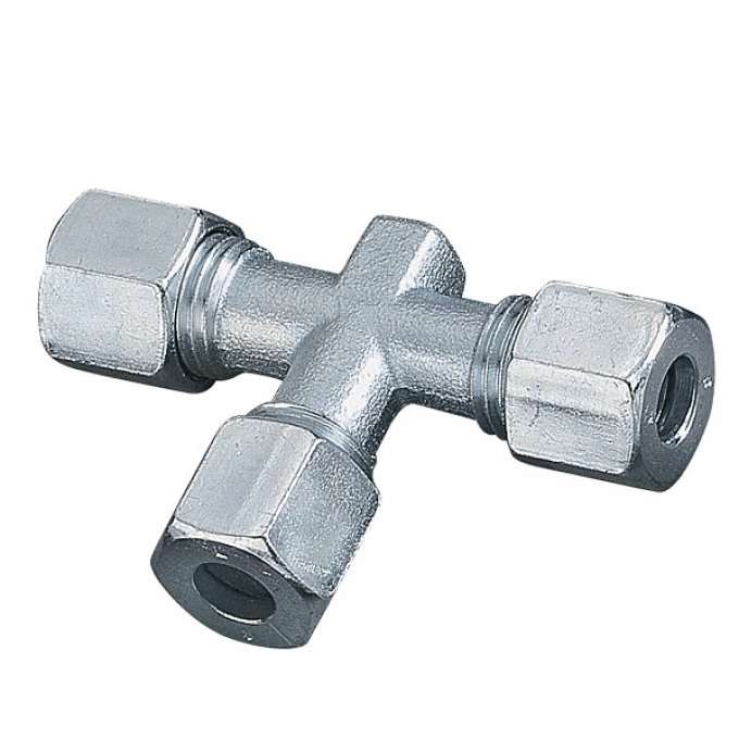Schneidring-Verschraubungen nach DIN. Aus Temperguss, galvanisch verzinkt. Zum Verbinden und Abzweigen von Gasleitungsrohren. Art Gasregler, Gasschläuche: Leitungen und Zubehör, Ausführung: 10/10/10 mm, Farbe: silber