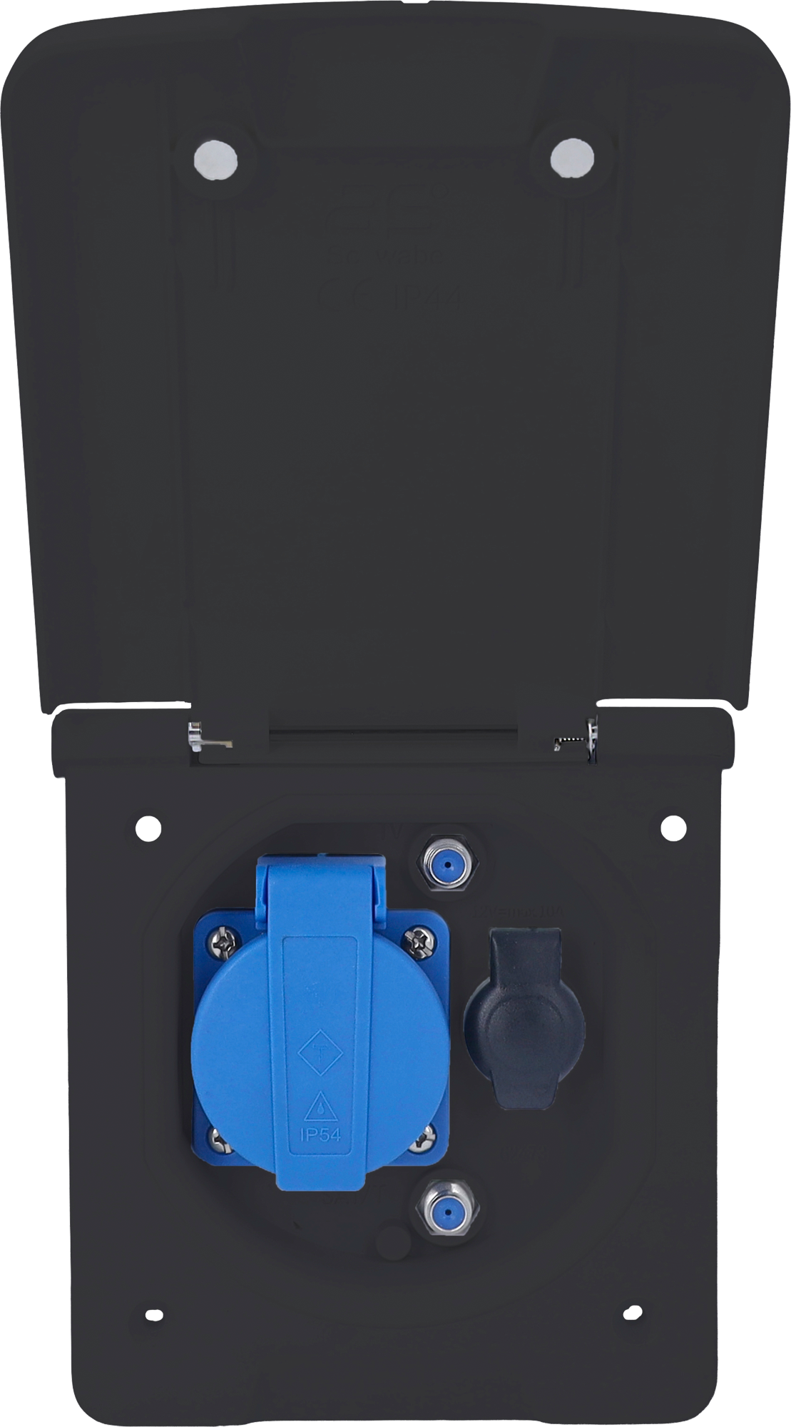 Caravan Vorzelt-Multifunktionsdose Diese Einbausteckdose bietet dir vielseitige Anschlüsse im kompakten Design. Mit Klappdeckel und Magnetverschluss bleibt alles geschützt. Das Gehäuse ist aus UV-beständigem Kunststoff (Kunststoff) gefertigt. Dank Schutzart IP44 kannst du die Dose auch im Außenbereich nutzen. Details: * 1 Schutzkontaktsteckdose 230 V / 16 A mit Klappdeckel * 1 Steckdose 12 V DC * 2 SAT-Steckdosen * Klappdeckel mit Magnetverschluss, Öffnungswinkel 180° * Sichtteile aus UV-beständigem Kunststoff (Kunststoff) * Hohe Brandschutzklasse 850 °C, selbstverlöschend * In 3 verschiedenen Varianten erhältlich Technische Daten: * Flanschmaß (H × B): 145 × 130 mm * Lochabstand (H × B): 94 × 92 mm * Einbautiefe: 66 mm * 230 V, 16 A, 3-polig, 6 h * Schutzart IP44: fremdkörper- und spritzwassergeschützt Lieferumfang: * 1 Caravan Vorzelt-Multifunktionsdose Art Kabel, Kupplung, Schalter und Stecker: Steckdose, Farbe: schwarz