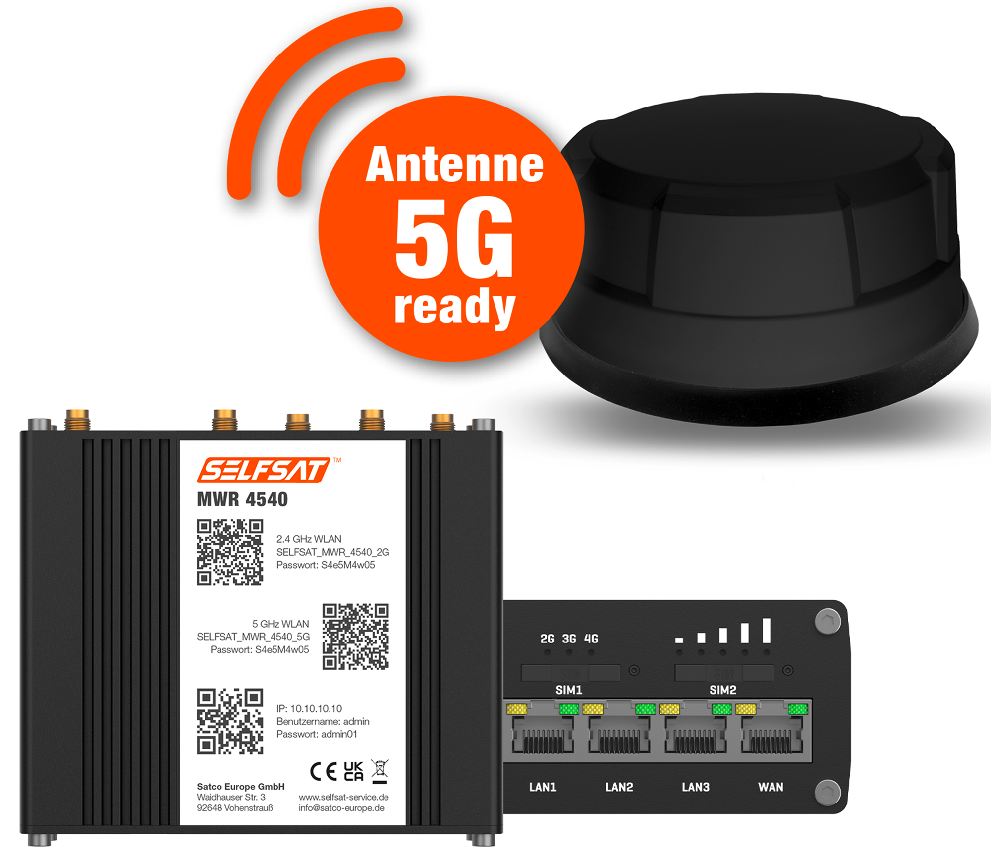 Selfsat MWR 4540 Router für stabiles WLAN im Wohnmobil Der MWR 4540 Router bietet eine zuverlässige Verbindung zum 4G LTE Mobilfunknetz, Campingplatz-WLANs und ist Starlink-kompatibel. Mit zwei SIM-Karten-Einschüben, GPS-Ortung und VPN-Unterstützung sorgt er für Internet auf Reisen. Einfach über QR-Codes oder WLAN-Namen eingerichtet, sendet er stabiles WLAN im Fahrzeug. Staub- und wasserdichte Außenantennen sorgen für guten Empfang auch bei schwierigen Bedingungen. Details * Verbindung zum 4G LTE Mobilfunknetz (bis zu 300 Mbps) * Unterstützung von Campingplatz-WLANs (Captive Portal) * GPS-Ortung des Fahrzeugs möglich * Einfache Einrichtung und Bedienung Technische Daten Router * Unterstützte Mobilfunknetze: 4G LTE (bis 300 Mbps), 3G (bis 42 Mbps) * WiFi-Frequenzen (Eingang/Ausgabe): 2.4 GHz, 5 GHz * 2 SIM-Karteneinschübe (Mini SIM) * Ethernet-Schnittstellen: 1 x WAN, 3 x LAN RJ45 * Spannungsversorgung: 9 – 50 Volt DC * Abmessungen: 115 x 44,2 x 95,1 mm, Gewicht: 460 g * Schutzklasse: IP30 Technische Daten Antenne * Frequenzbereiche: 617 – 960 MHz, 1710 – 3800 MHz, 4900 – 6000 MHz * Signalgewinn: +4 bis +9 dBi je nach Frequenz * WLAN 2.4 GHz / 5 GHz, GPS mit +26 dBi Signalgewinn * Schutzklasse: IP69K * Abmessungen: 180 x 80 mm Lieferumfang * MWR 4540 Router * 4-poliges Stromanschlusskabel * Montage-Kit * 2 SIM-Kartenadapter * Panorama Dachantenne * Wi-Fi Innenantenne * Klettverschluss-Klebepunkte * Montage- und Bedienungsanleitung Art Internet & WLAN: Router, Farbe: schwarz