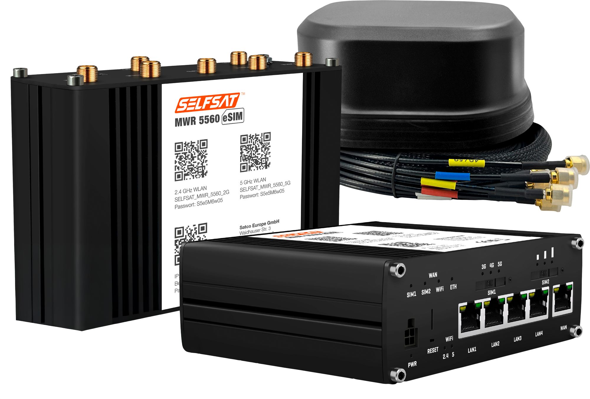 SELFSAT MWR 5560 WLAN Router eSIM 5G Cat 20 bis 3,4 Gbps inklusive SATCO 5G Antenne schwarz – 5G-/LTE-Antennen